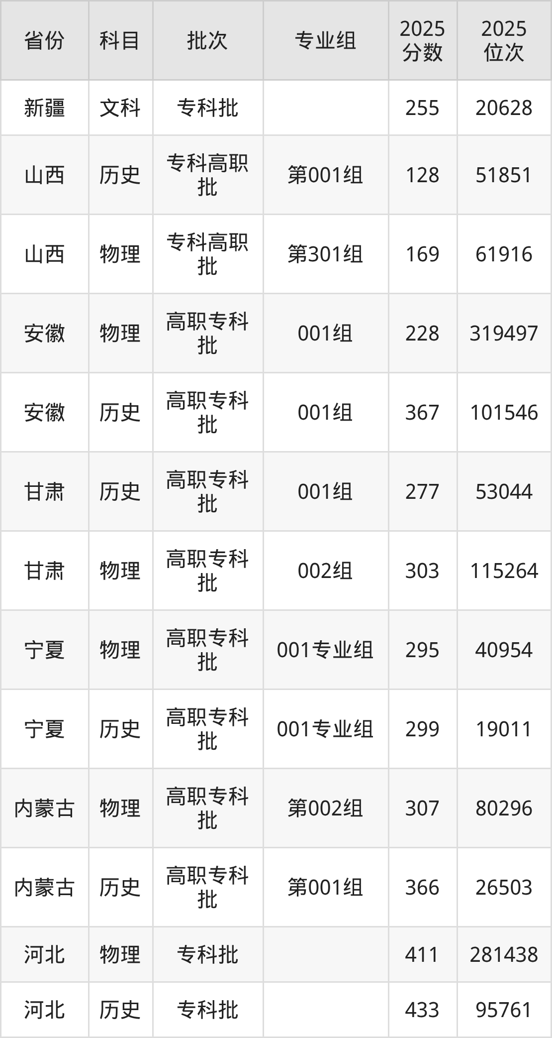 普通类专科物理类最低169分,专科历史类最低128分