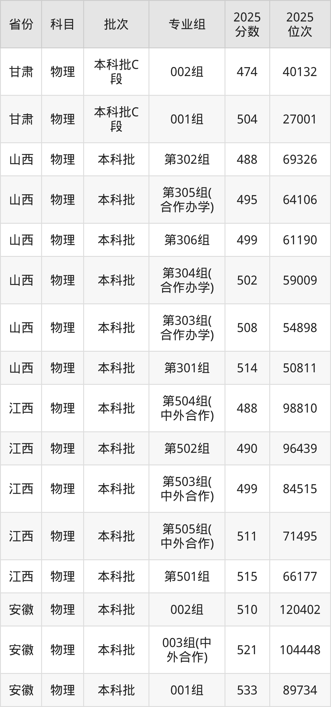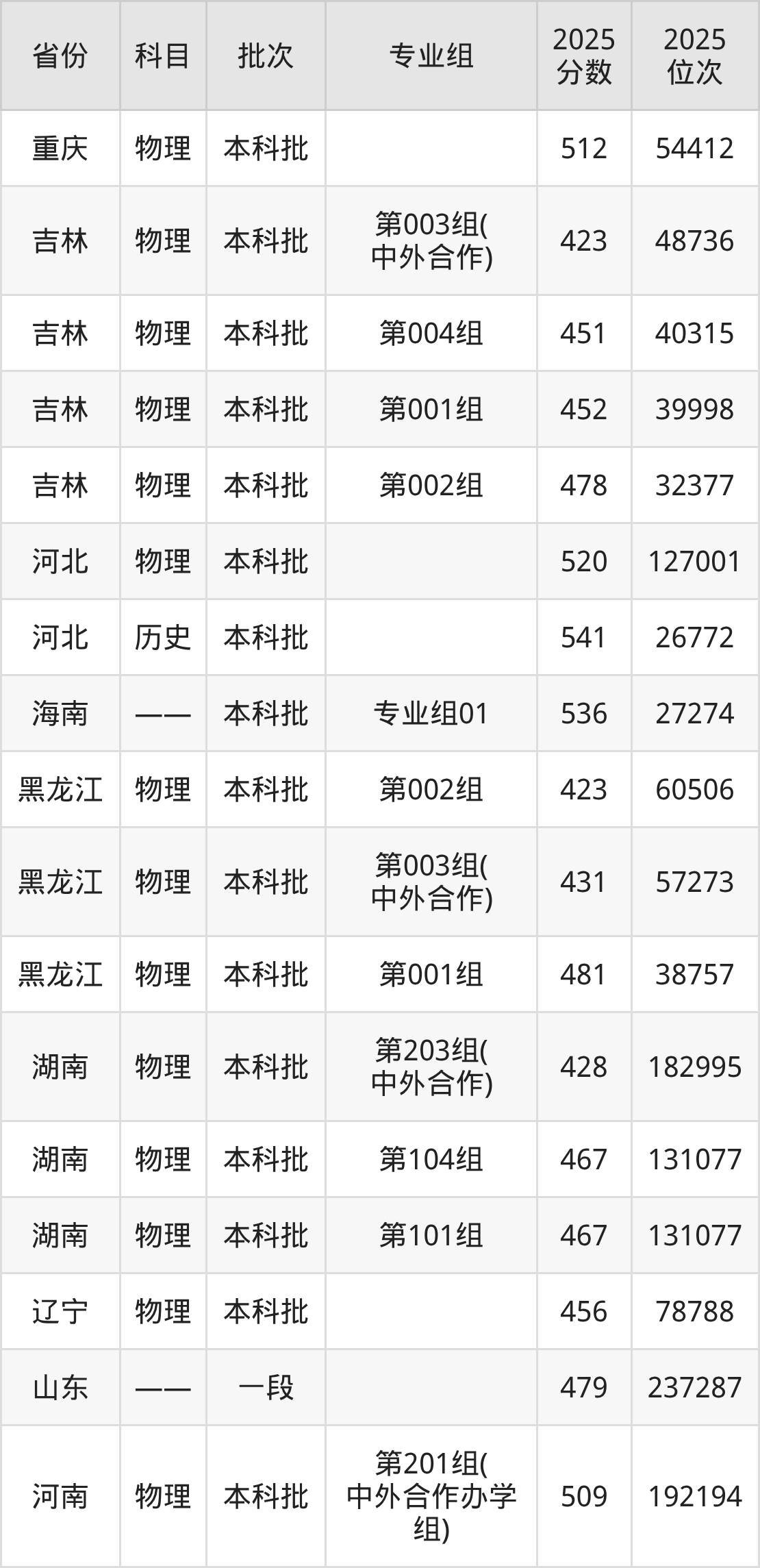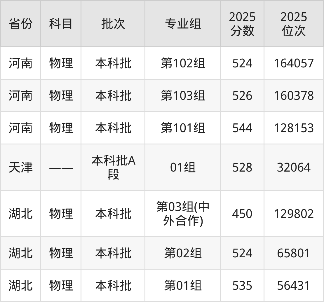 2025年在本科物理类进行招生,各专业组分数线详情如下: