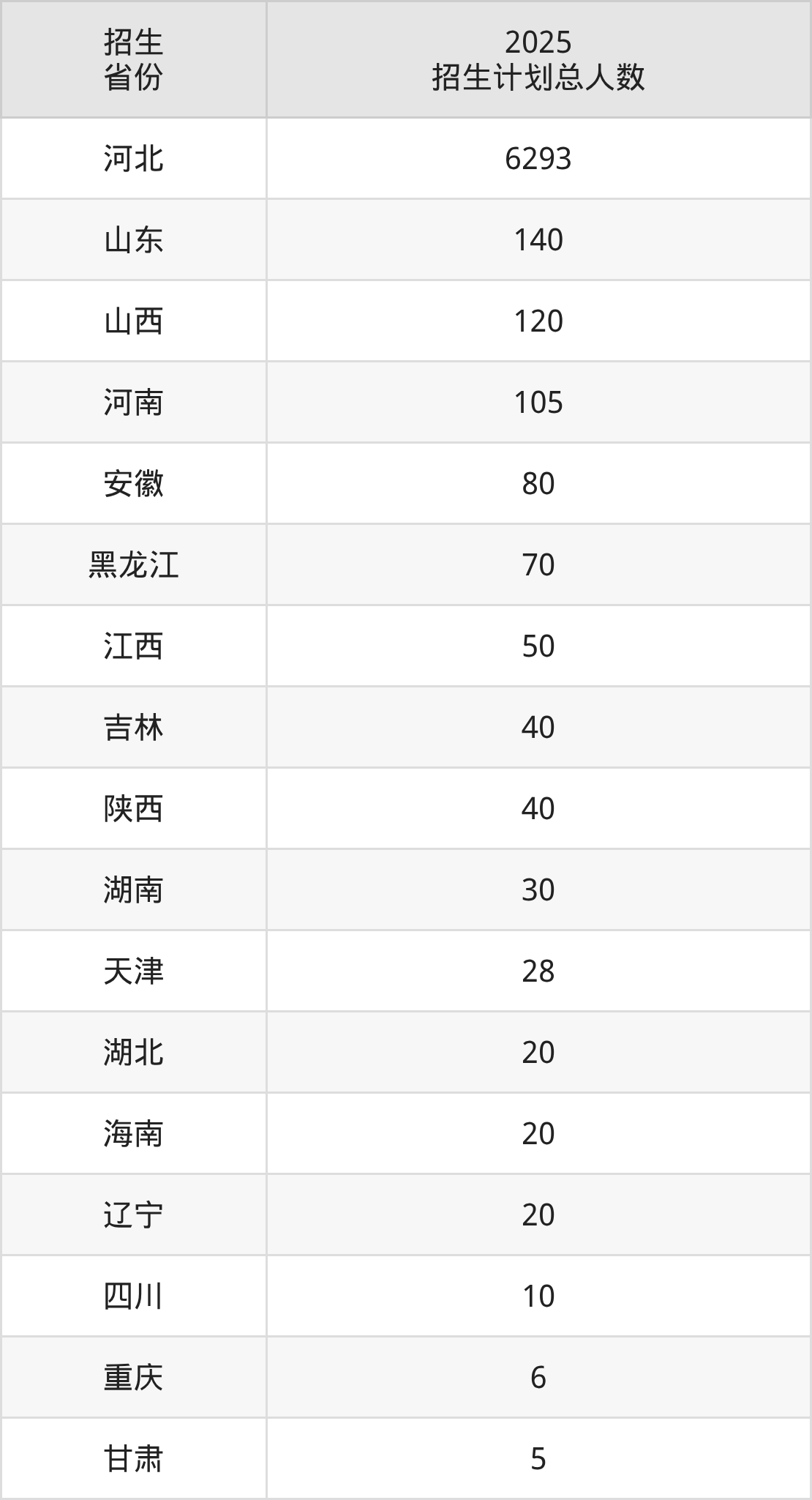 2025年河北农业大学面向全国17个省市开展本科招生;招生专业共63个,招生人数共7077人。2025年在河北省招生计划总人数是6293人,其中,河北农业大学在河北省招生人数最多的是动物医学。河北农业大学在各省具体招生人数情况如下表。