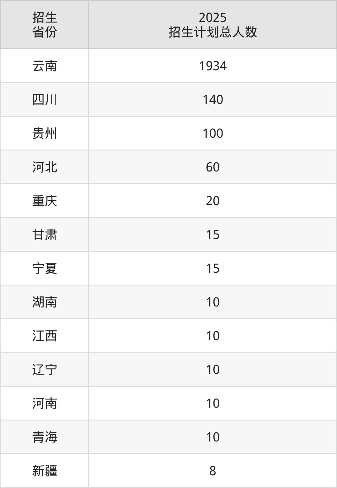 2025年昭通卫生职业学院面向全国13个省市开展专科招生;招生专业共20个,招生人数共2342人。2025年在云南省招生计划总人数是1934人,其中,昭通卫生职业学院在云南省招生人数最多的是护理。昭通卫生职业学院在各省具体招生人数情况如下表。