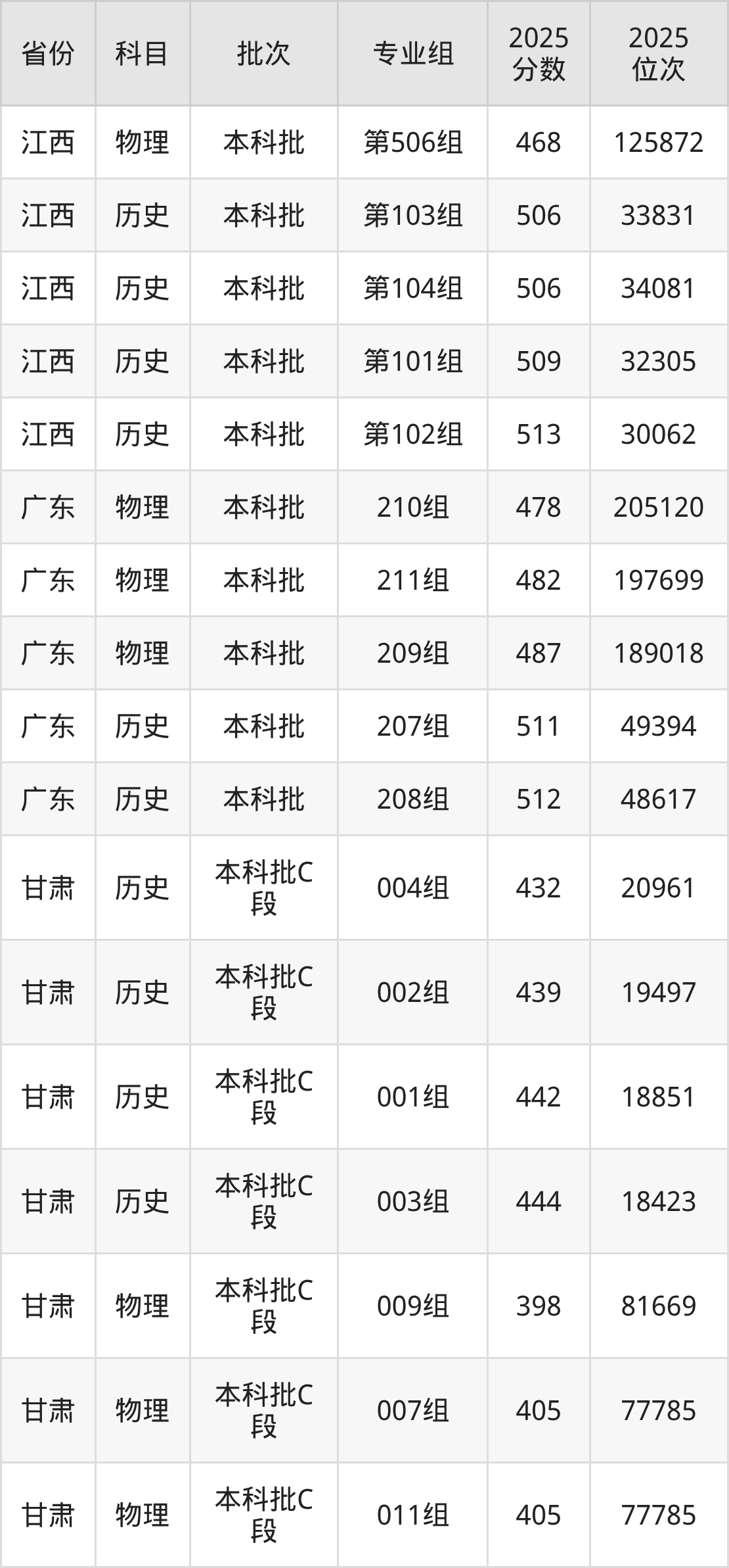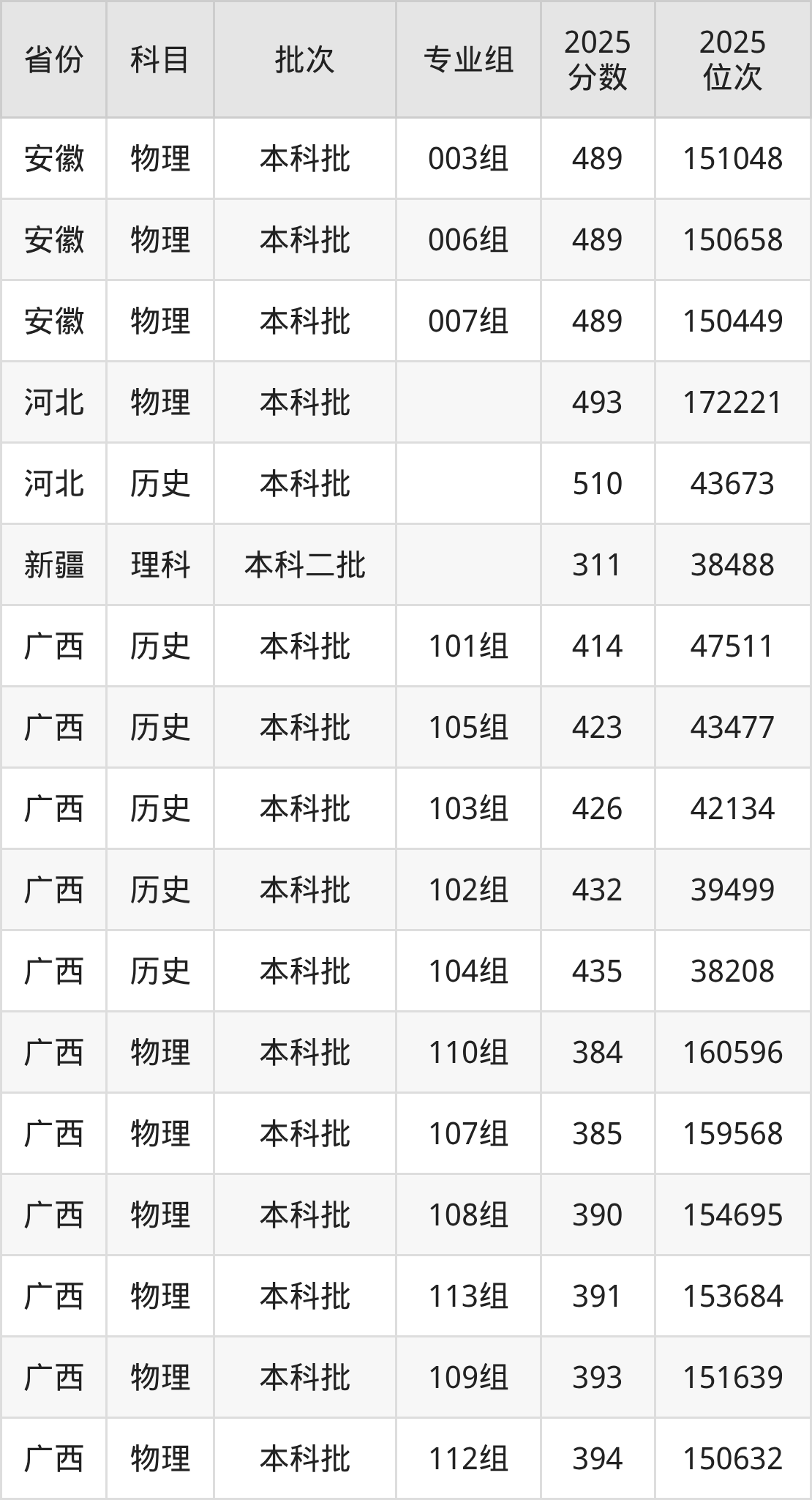 江苏师范大学科文学院007组:2025年投档录取最低分为489分,录取最低位次为150449名。
