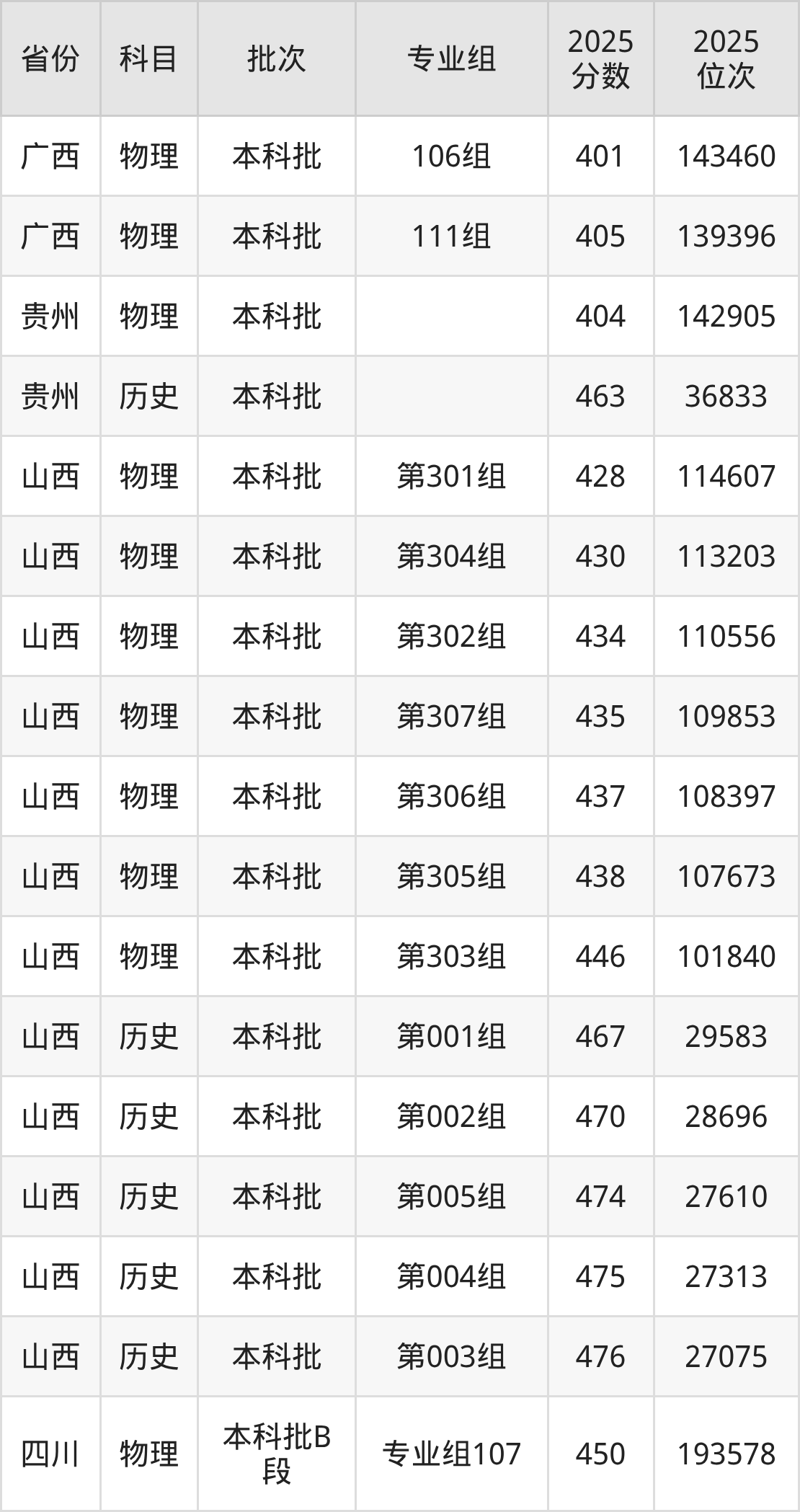 2025年投档录取最低分为404分,录取最低位次为142905名。
