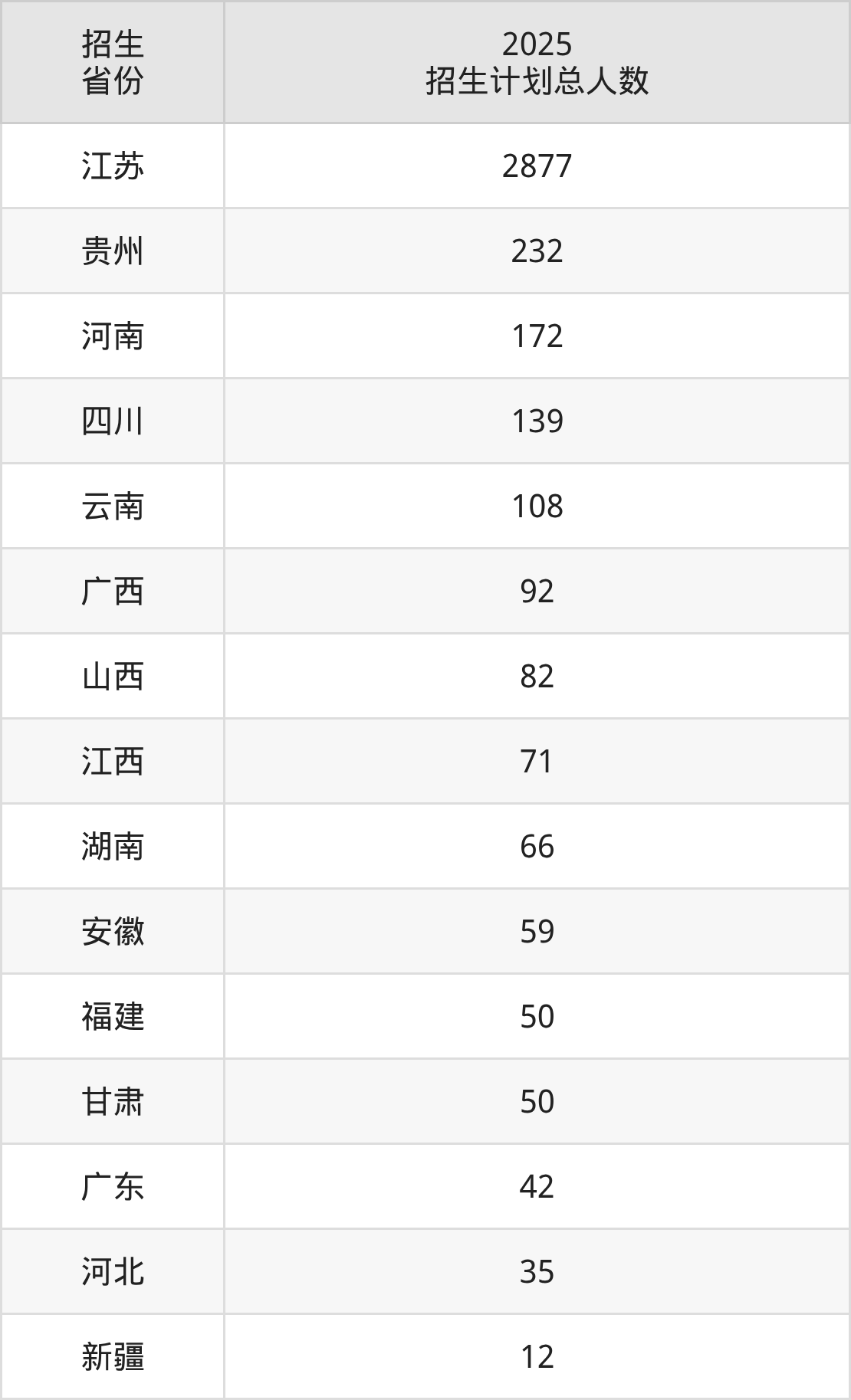 2025年江苏师范大学科文学院面向全国15个省市开展本科招生;招生专业共31个,招生人数共4087人。2025年在江苏省招生计划总人数是2877人,其中,江苏师范大学科文学院在江苏省招生人数最多的是汉语言文学。江苏师范大学科文学院在各省具体招生人数情况如下表。
