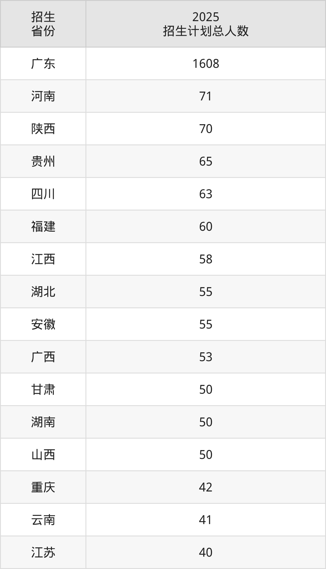 2025年南方医科大学面向全国28个省市开展本科招生;招生专业共29个,招生人数共2707人。2025年在广东省招生计划总人数是1608人,其中,南方医科大学在广东省招生人数最多的是临床医学。南方医科大学在各省具体招生人数情况如下表。