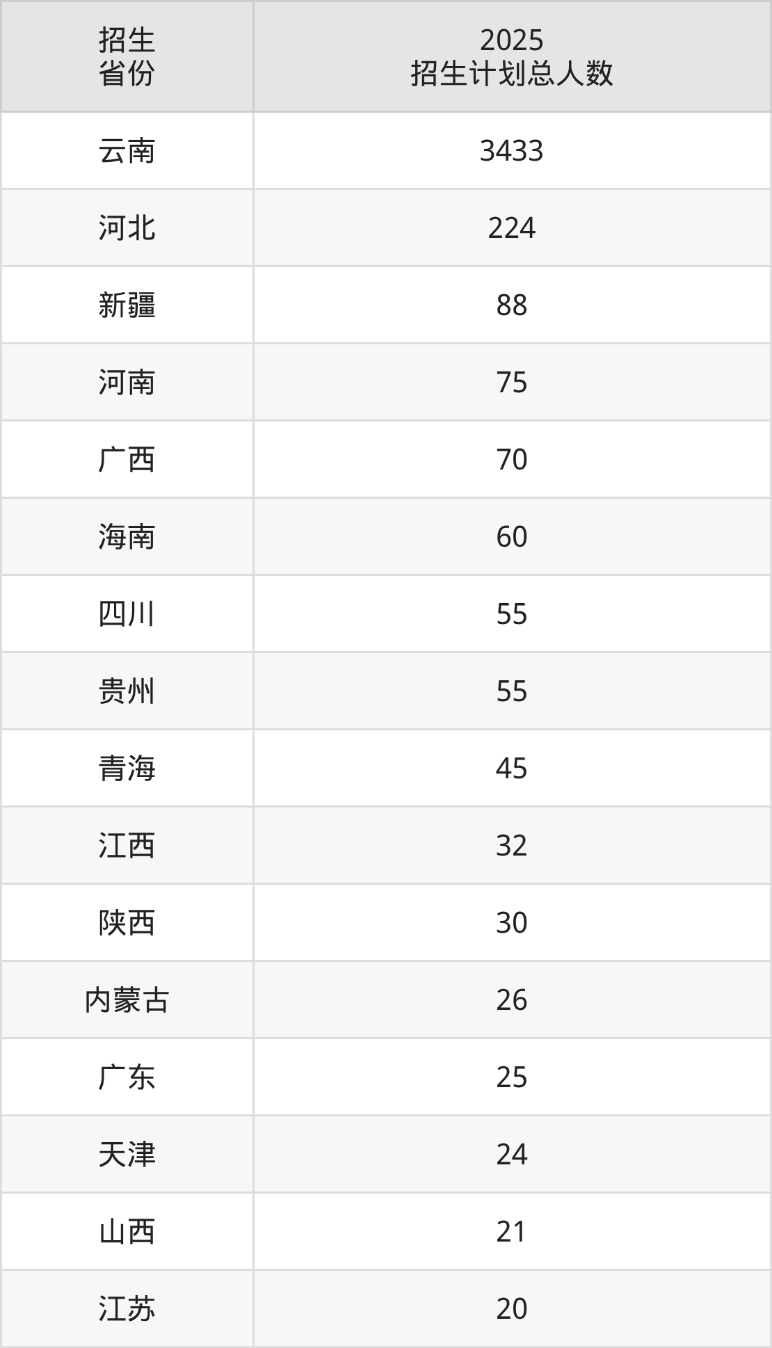 2025年昆明城市学院面向全国22个省市开展本科招生;招生专业共21个,招生人数共3414人。2025年在云南省招生计划总人数是3433人,其中,昆明城市学院在云南省招生人数最多的是汉语言文学。昆明城市学院在各省具体招生人数情况如下表。