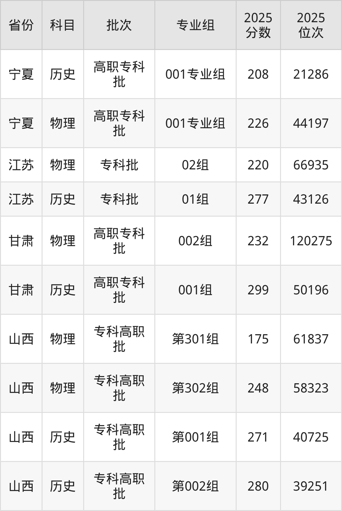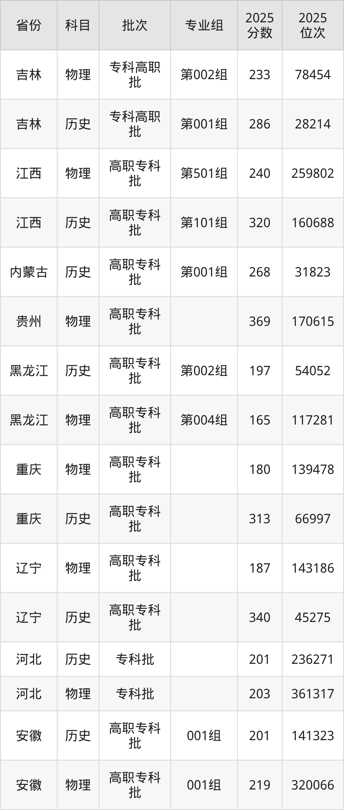 2025年在专科物理类进行招生,各专业组分数线详情如下: