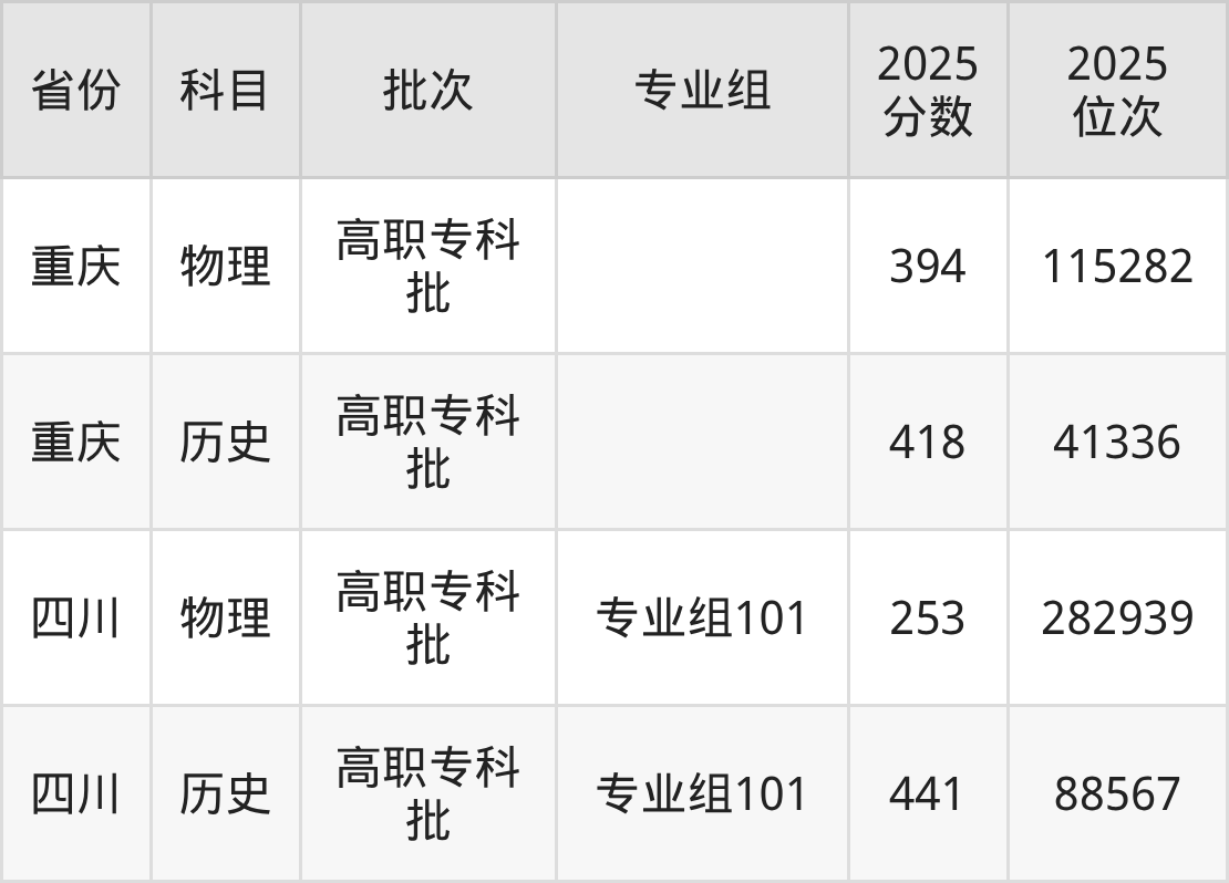 达州中医药职业学院专业组101:2025年投档录取最低分为253分,录取最低位次为282939名。