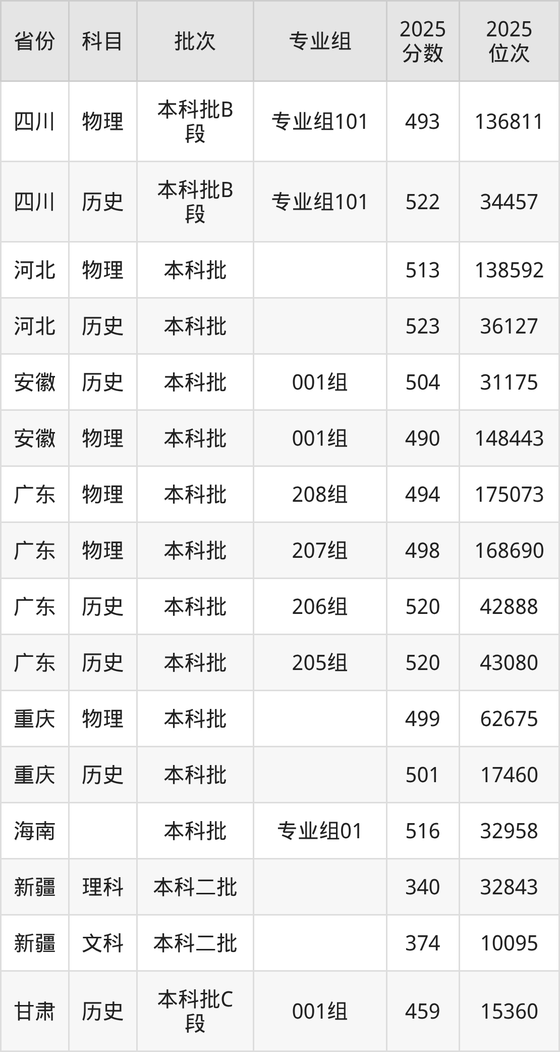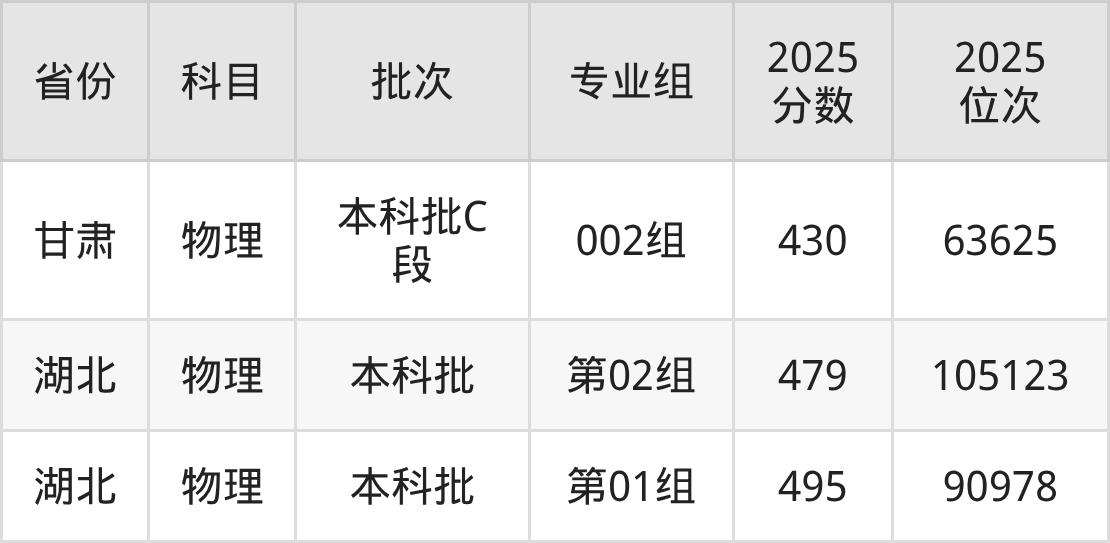 2025年在本科物理类进行招生,各专业组分数线详情如下: