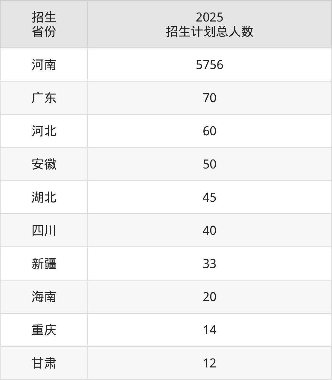 2025年信阳农林学院面向全国10个省市开展本科招生;招生专业共45个,招生人数共4430人。2025年在河南省招生计划总人数是5756人,其中,信阳农林学院在河南省招生人数最多的是林学。信阳农林学院在各省具体招生人数情况如下表。