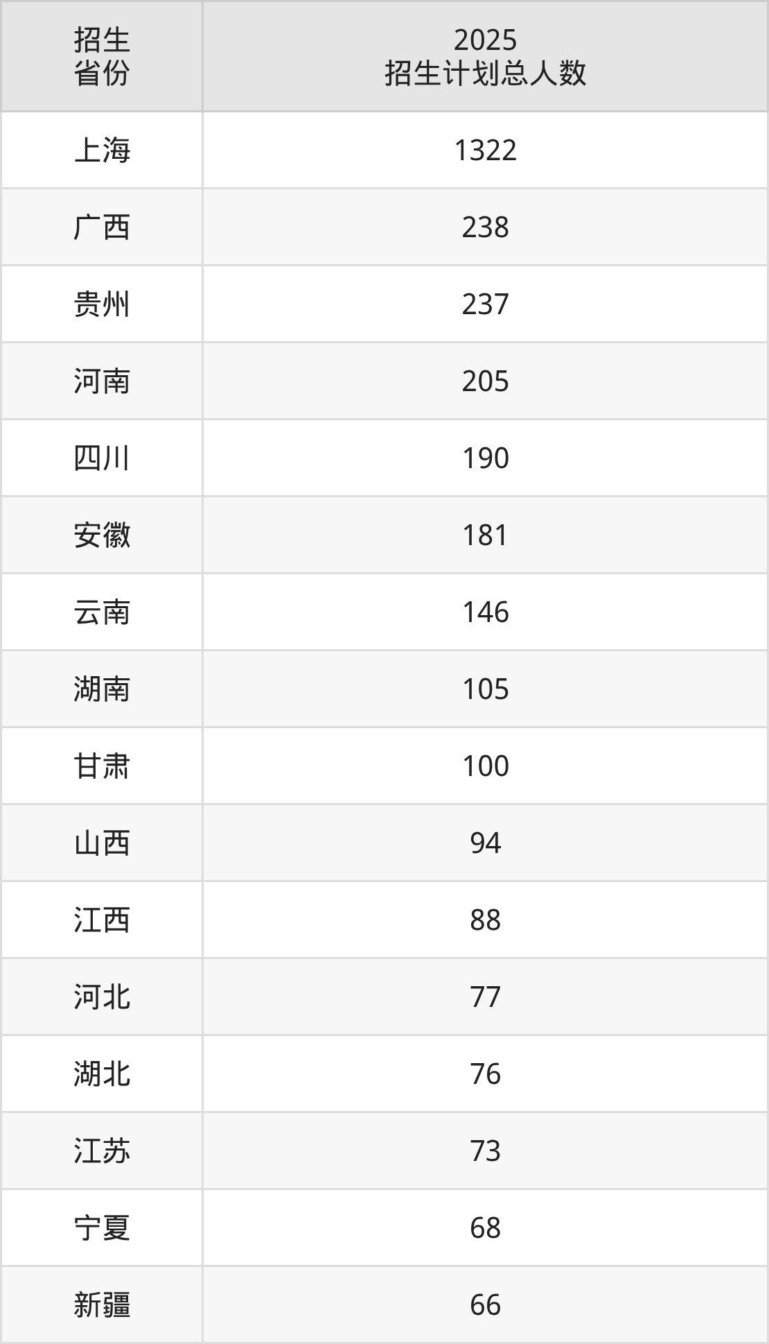 2025年上海理工大学面向全国27个省市开展本科招生;招生专业共27个,招生人数共3780人。2025年在上海市招生计划总人数是1322人,其中,上海理工大学在上海市招生人数最多的是工科试验班。上海理工大学在各省具体招生人数情况如下表。