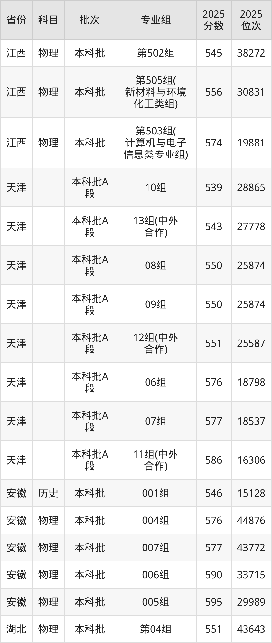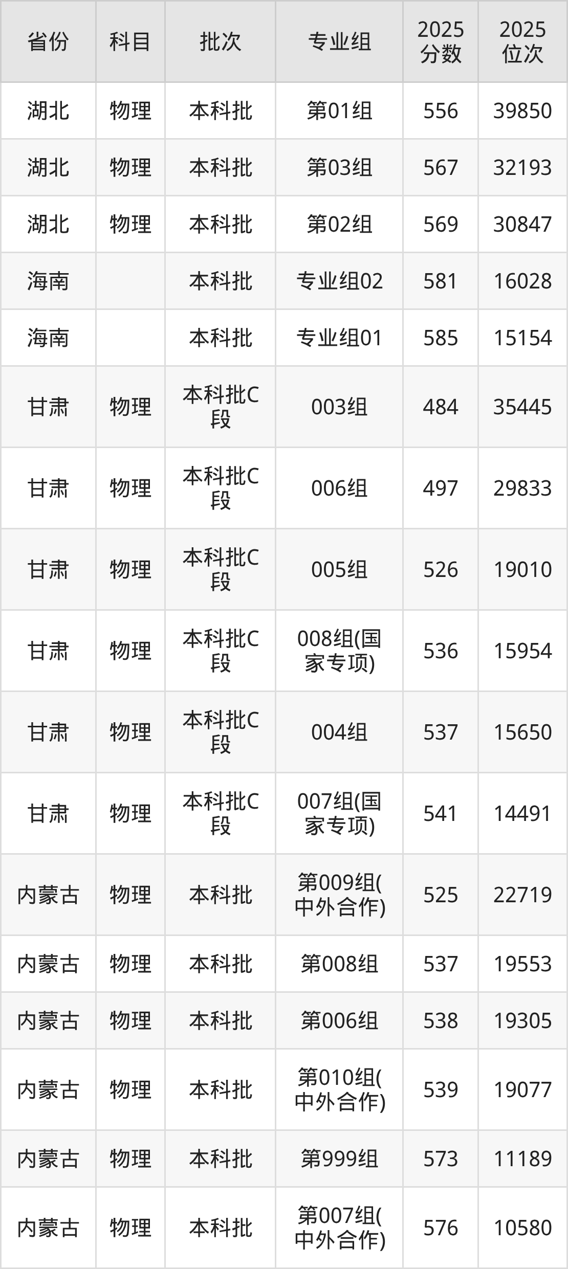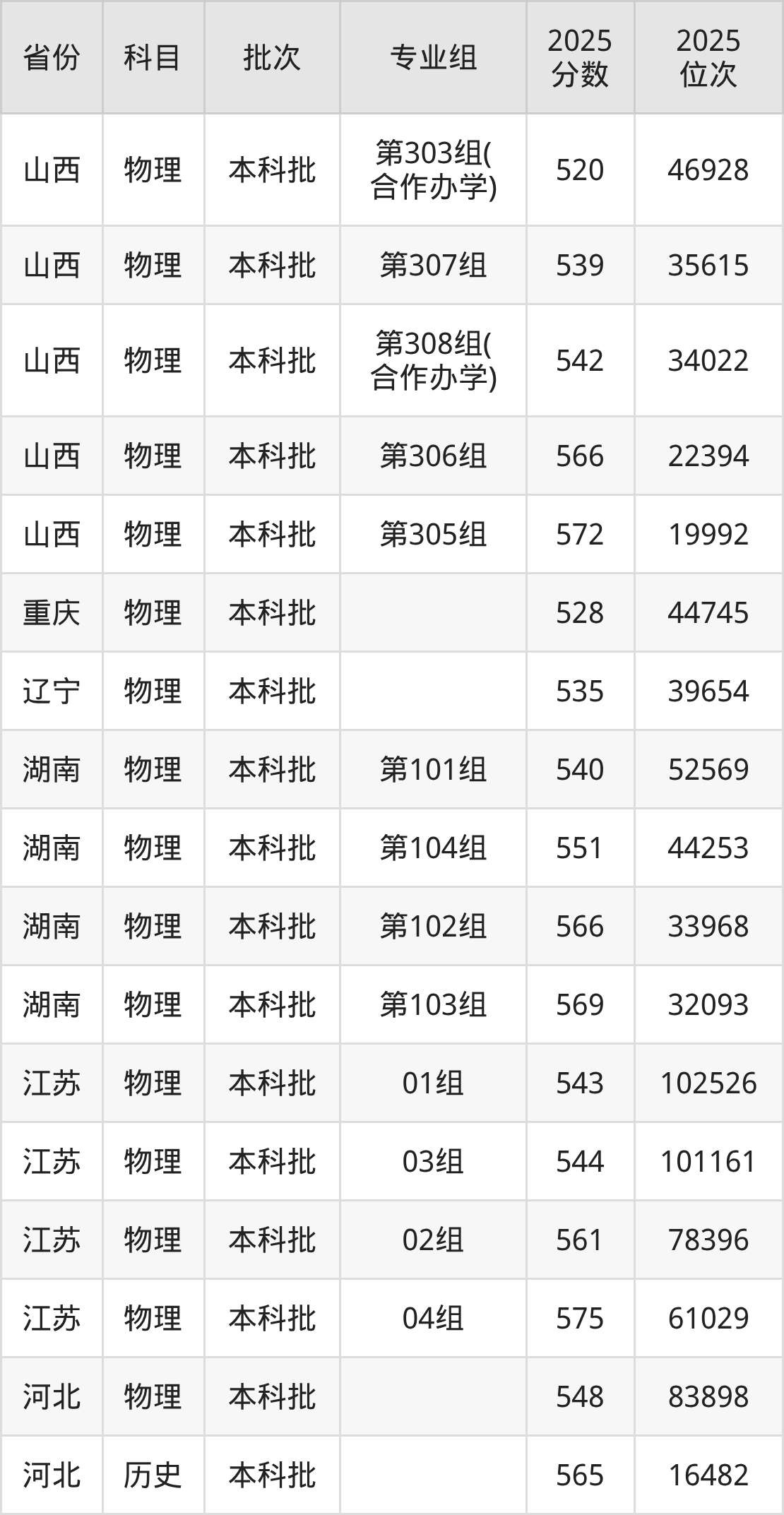 2025年在本科物理类进行招生,各专业组分数线详情如下: