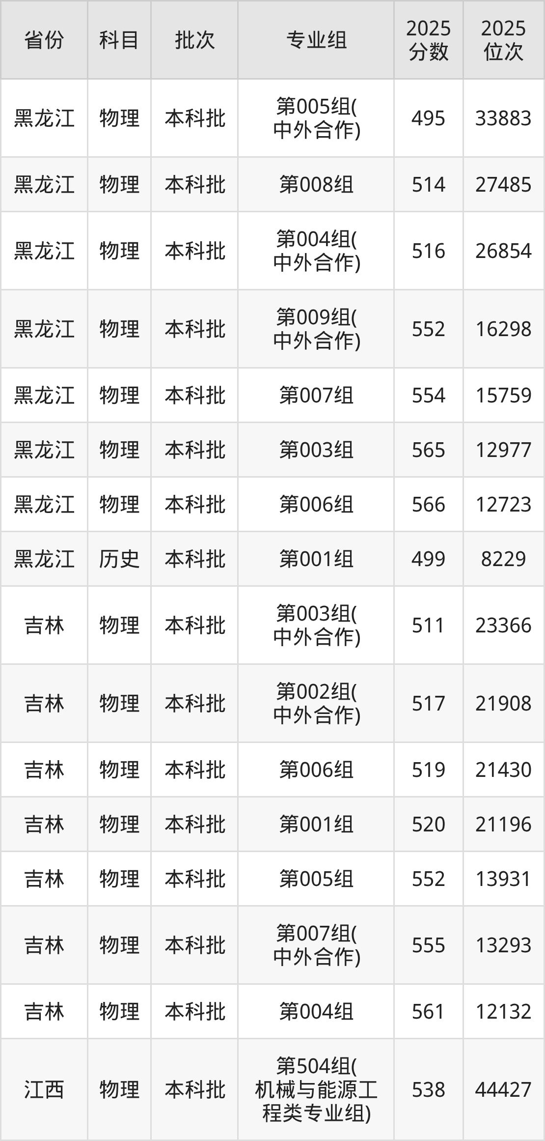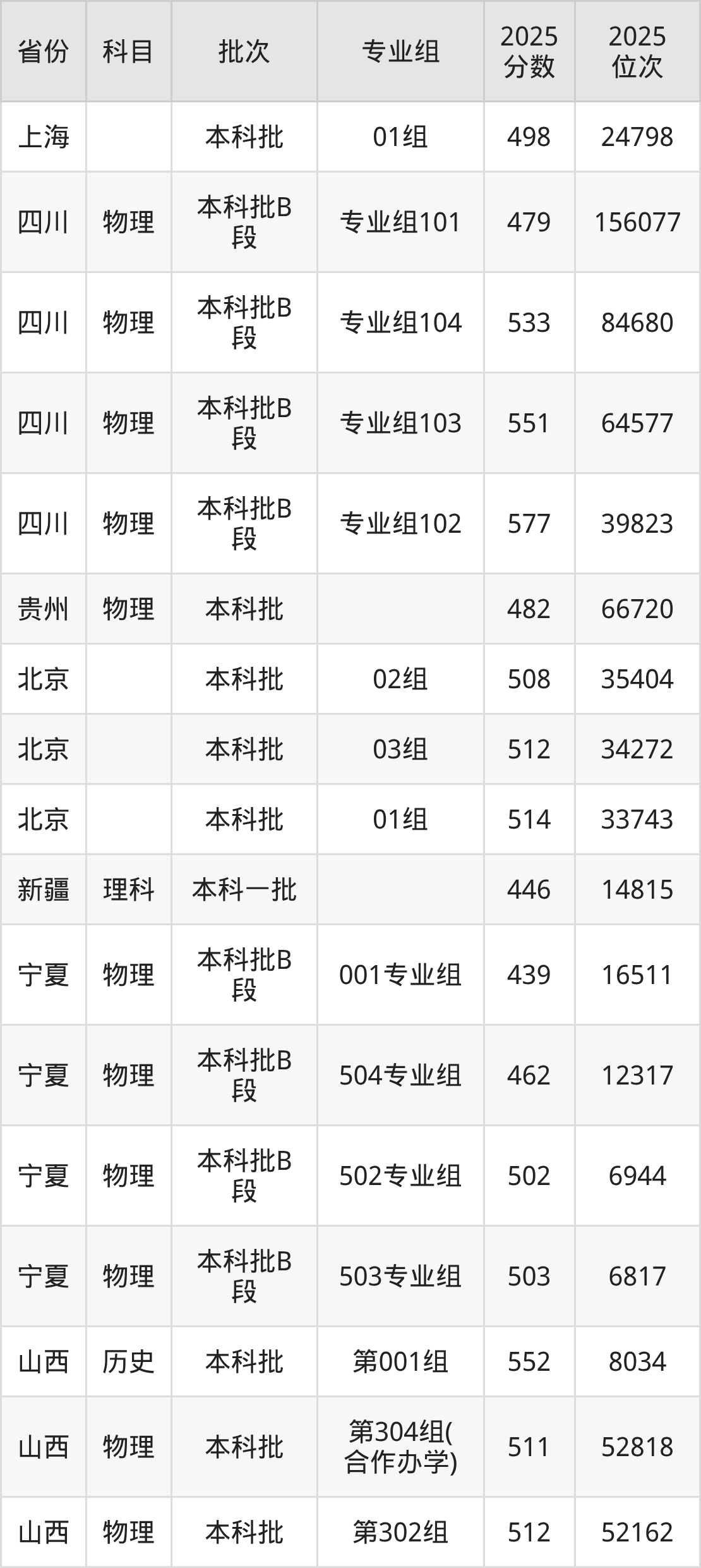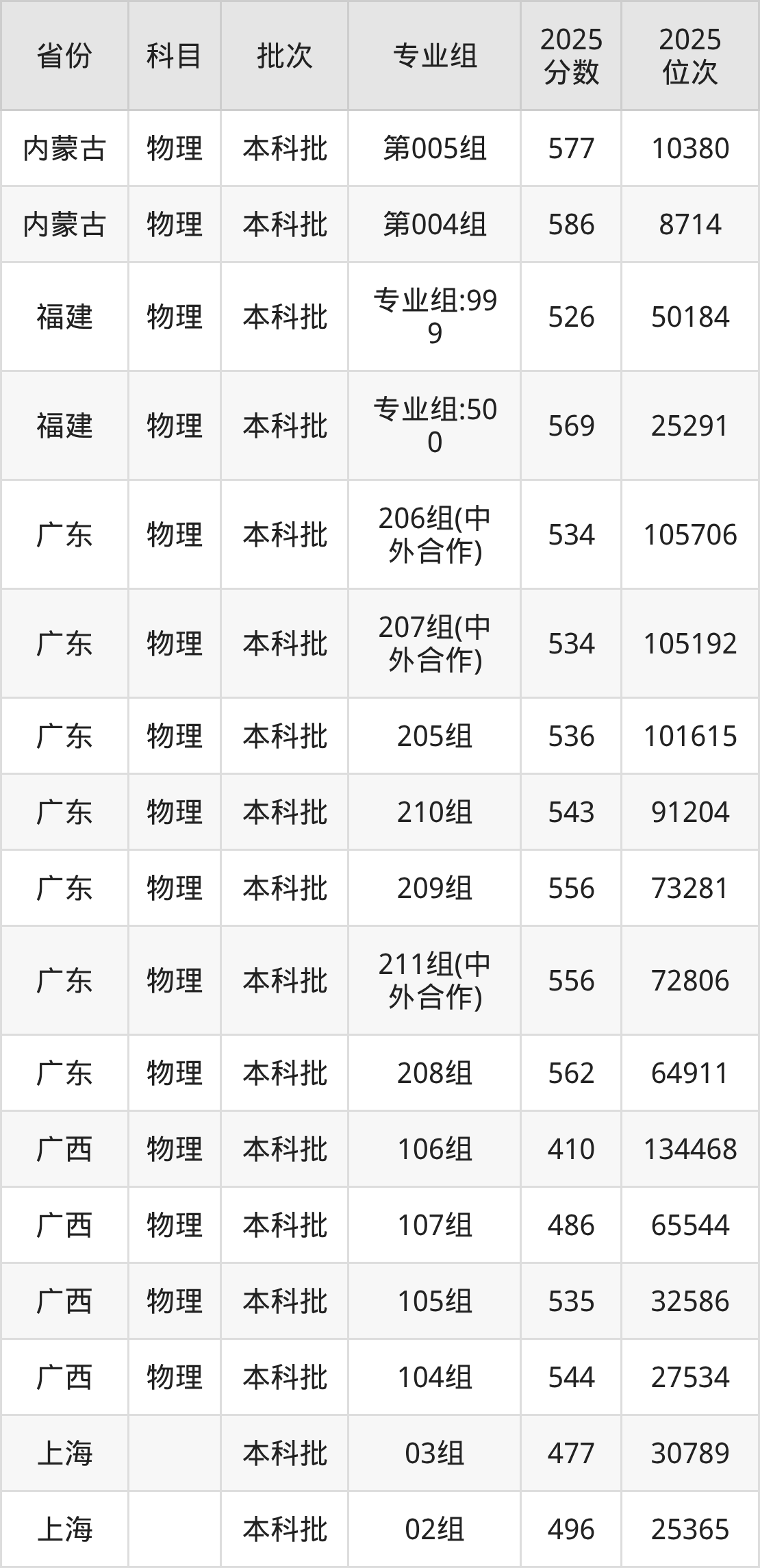 2025年在本科物理类进行招生,各专业组分数线详情如下: