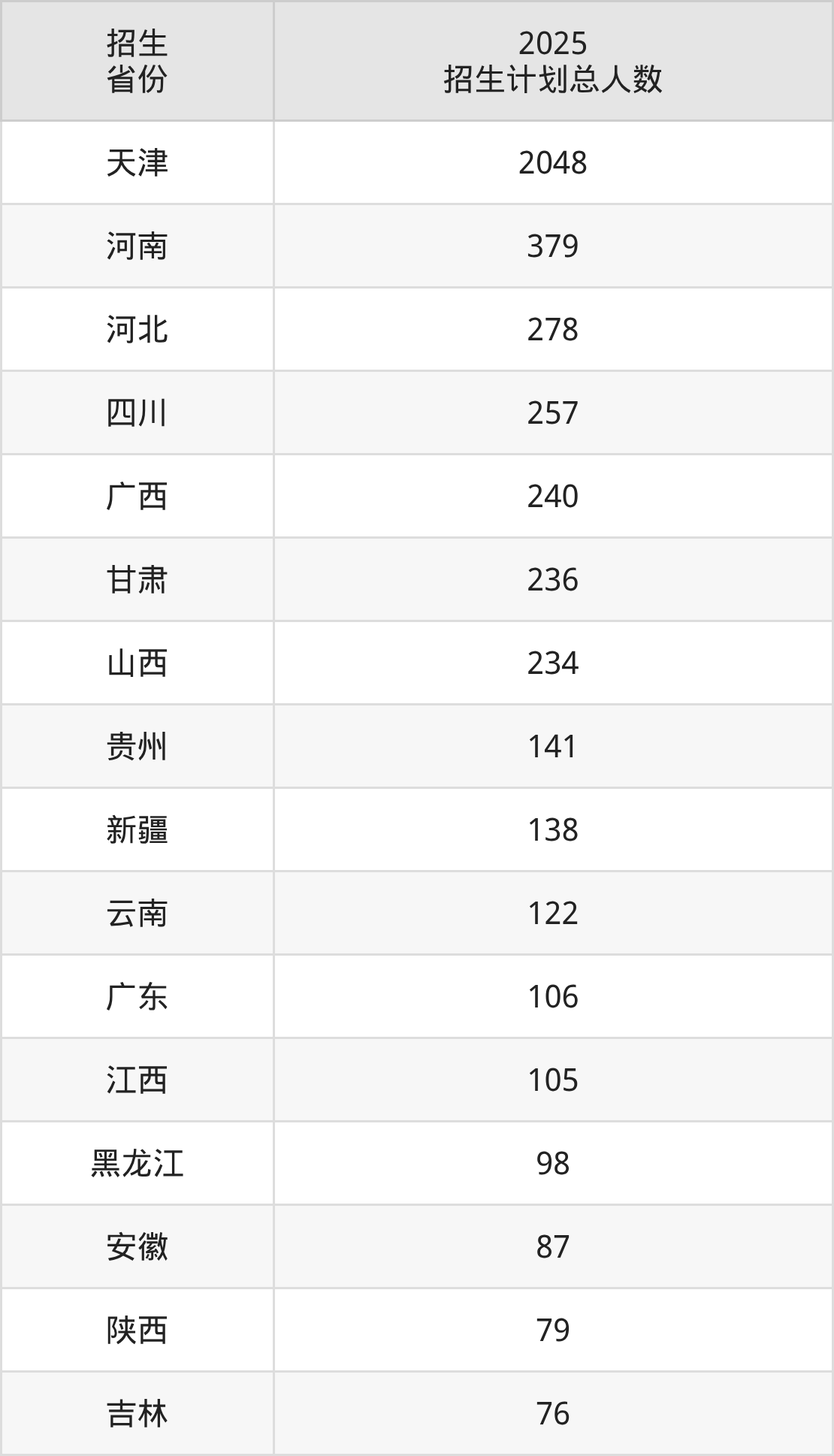 2025年天津理工大学面向全国28个省市开展本科招生;招生专业共54个,招生人数共5191人。2025年在天津市招生计划总人数是2048人,其中,天津理工大学在天津市招生人数最多的是软件工程。天津理工大学在各省具体招生人数情况如下表。