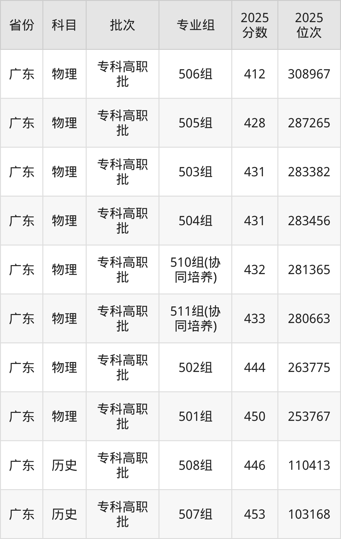 佛山职业技术学院506组:2025年投档录取最低分为412分,录取最低位次为308967名。