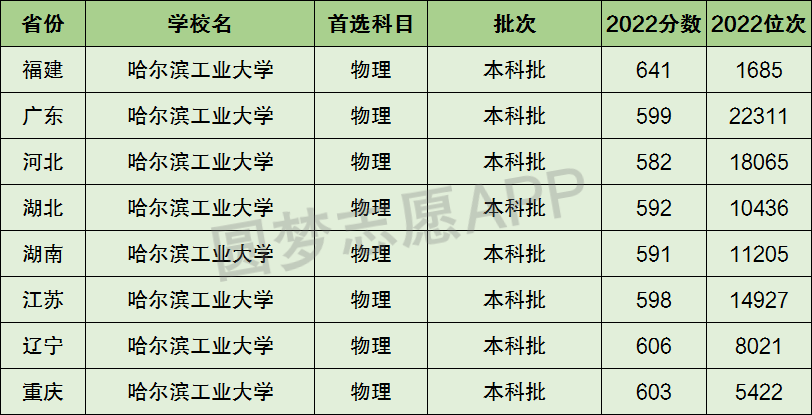 在物理类考生中,哈尔滨工业大学只有福建、辽宁、重庆这两个地区分数在600分以上。