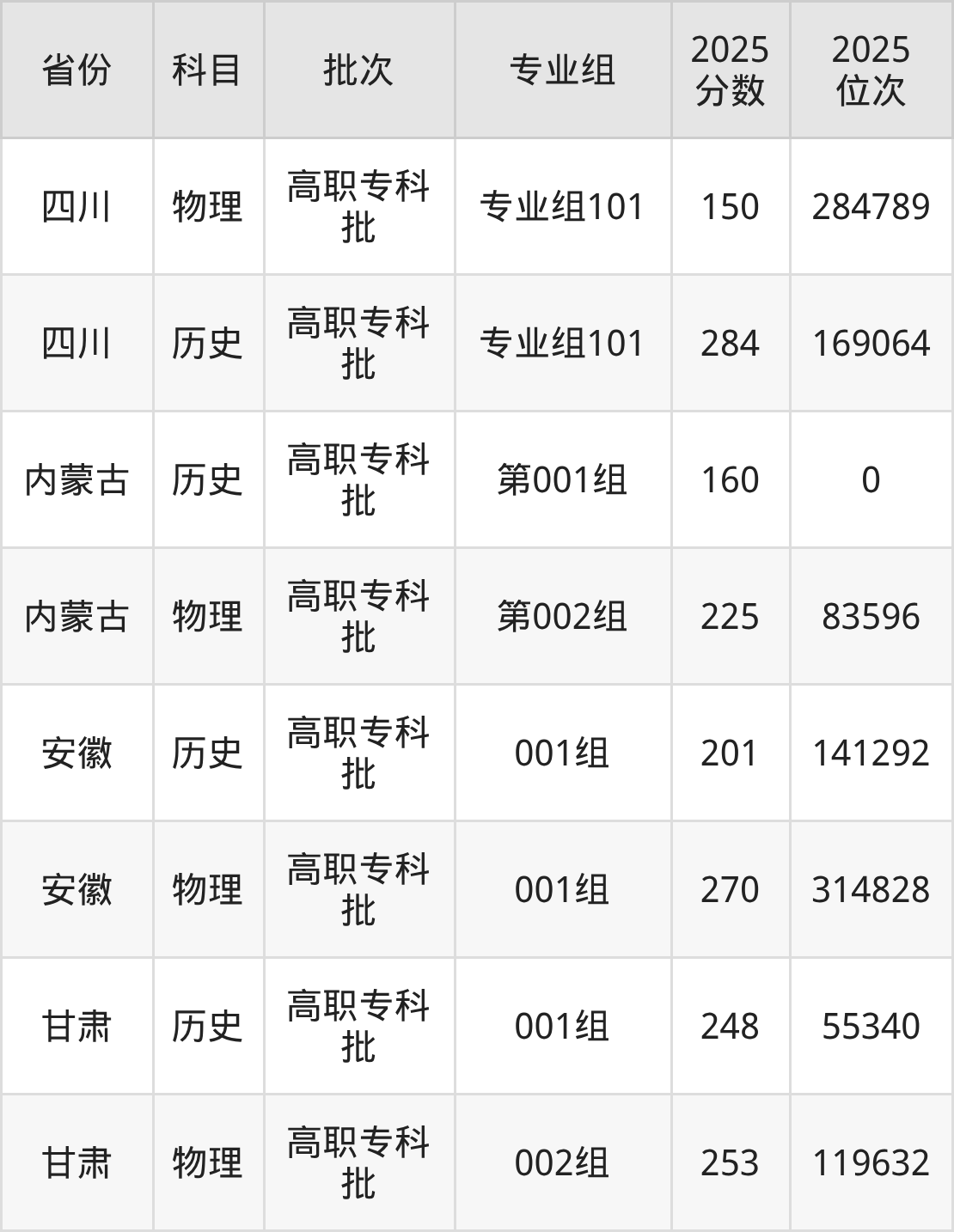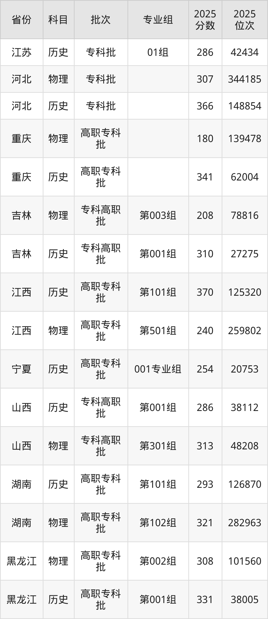 2025年在专科历史类进行招生,各专业组分数线详情如下: