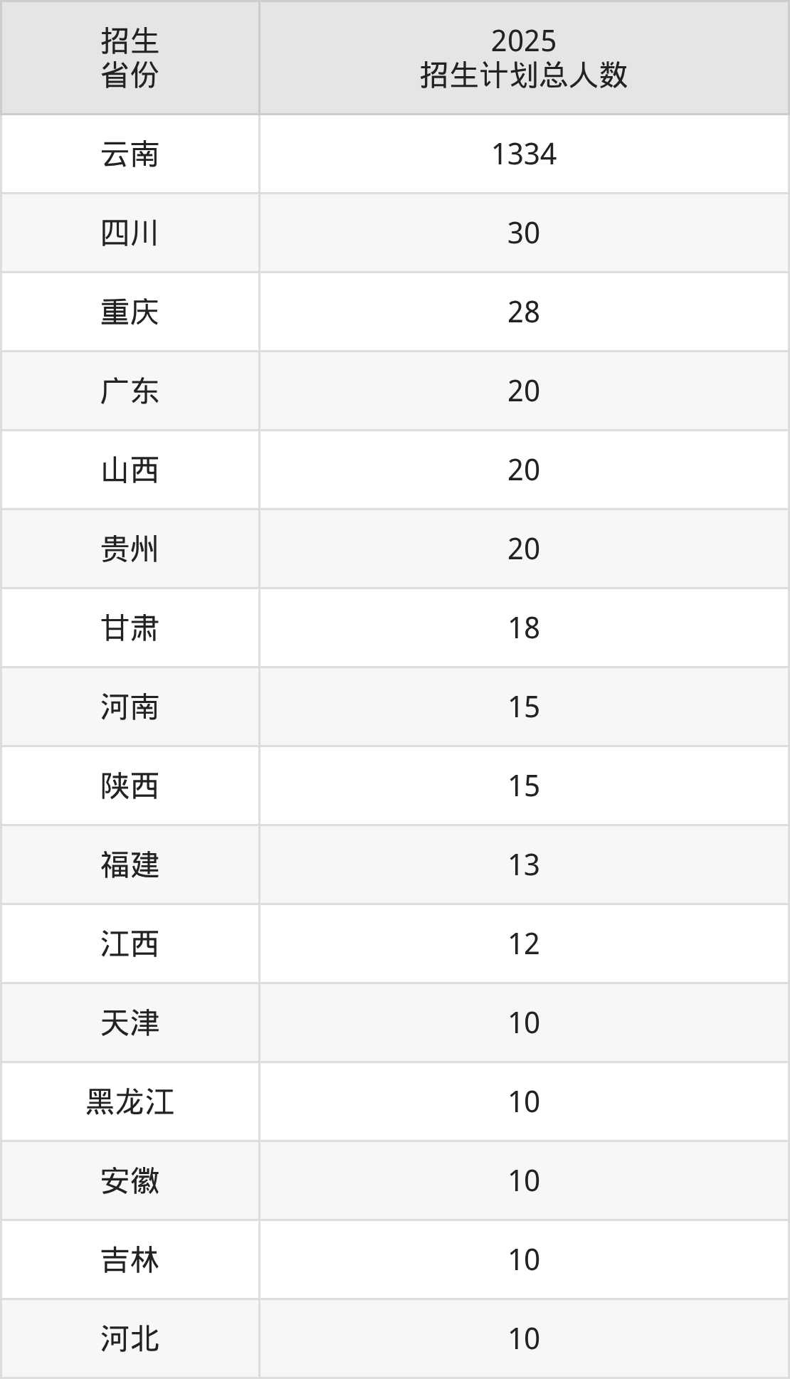 2025年楚雄医药高等专科学校面向全国17个省市开展专科招生;招生专业共18个,招生人数共1585人。2025年在云南省招生计划总人数是1334人,其中,楚雄医药高等专科学校在云南省招生人数最多的是临床医学。楚雄医药高等专科学校在各省具体招生人数情况如下表。