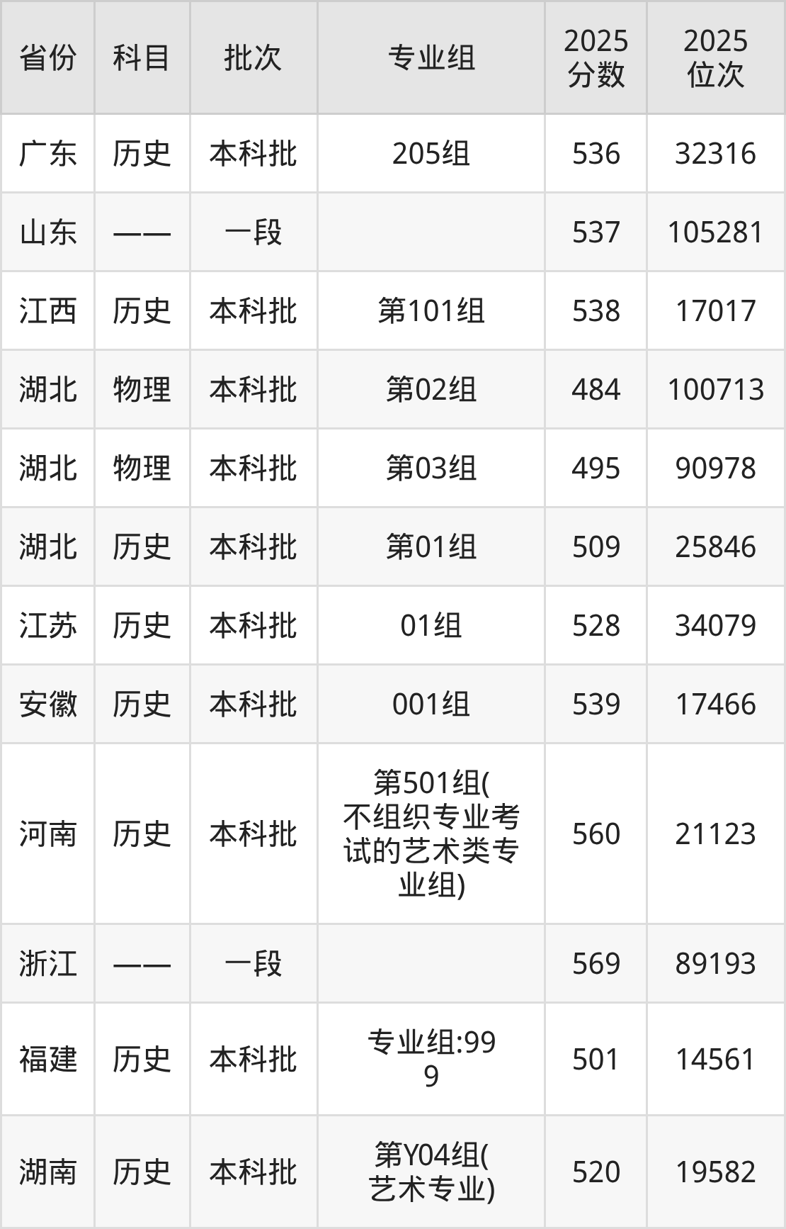 下面是2025年湖北美术学院全国录取分数线一览表,请查阅。