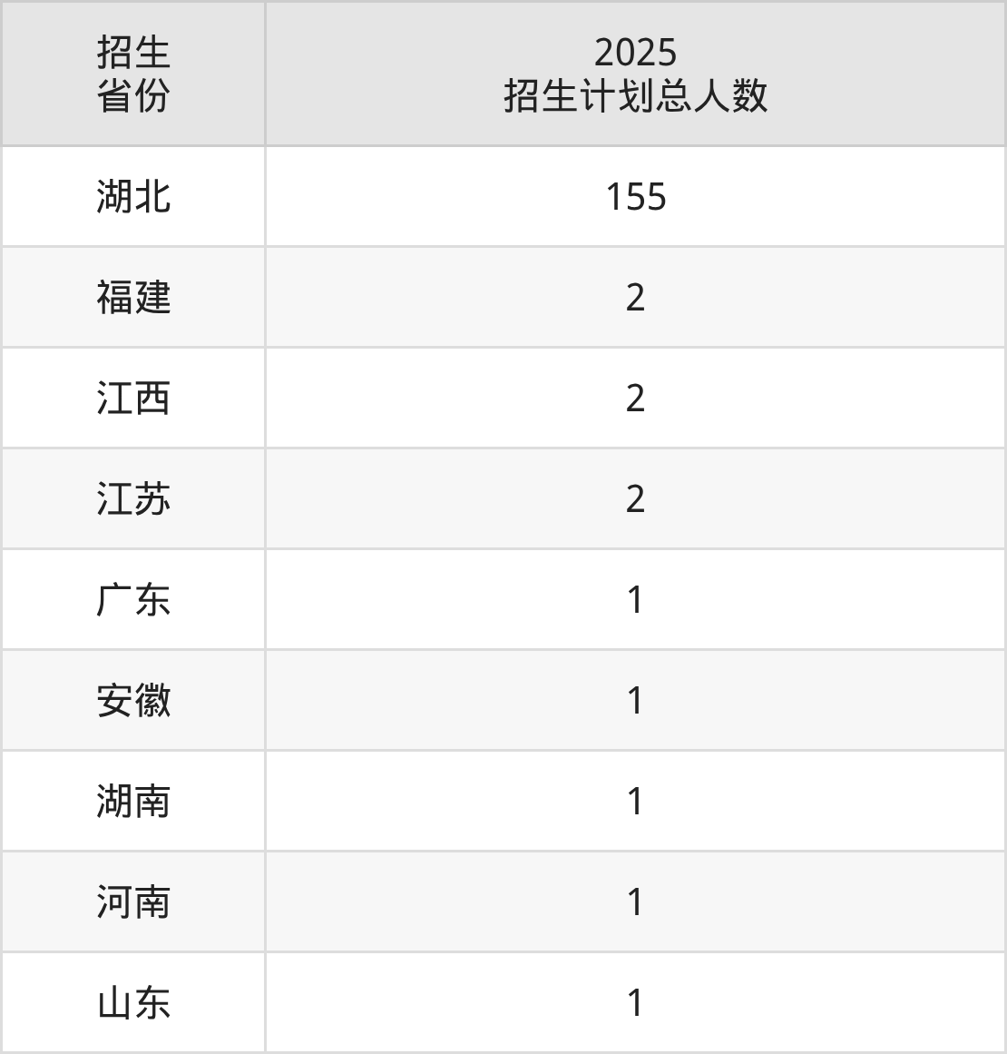 2025年湖北美术学院面向全国9个省市开展本科招生;招生专业共6个,招生人数共166人。2025年在湖北省招生计划总人数是155人,其中,湖北美术学院在湖北省招生人数最多的是风景园林。湖北美术学院在各省具体招生人数情况如下表。