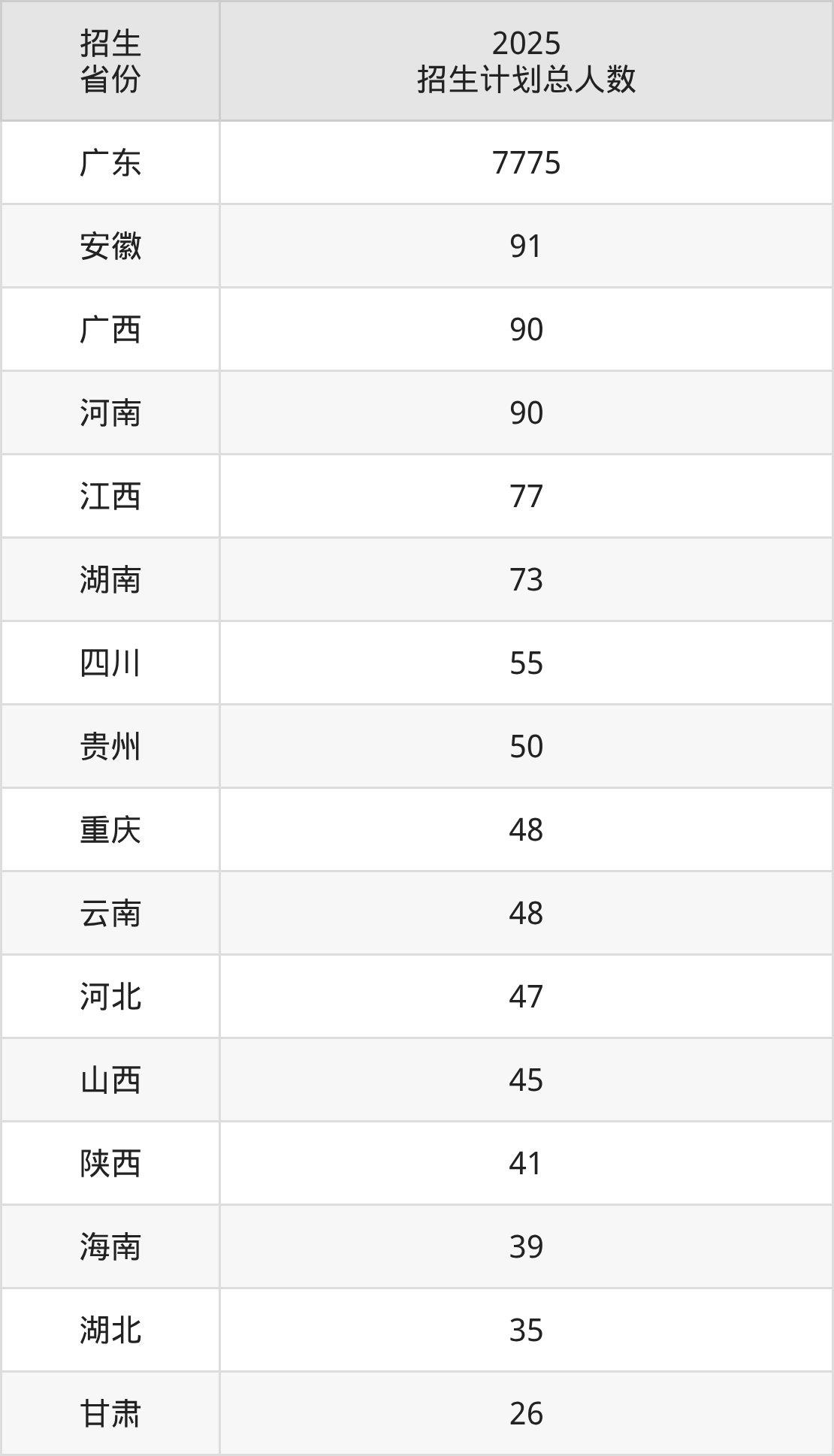 2025年岭南师范学院面向全国28个省市开展本科招生;招生专业共59个,招生人数共8806人。2025年在广东省招生计划总人数是7775人,其中,岭南师范学院在广东省招生人数最多的是汉语言文学。岭南师范学院在各省具体招生人数情况如下表。
