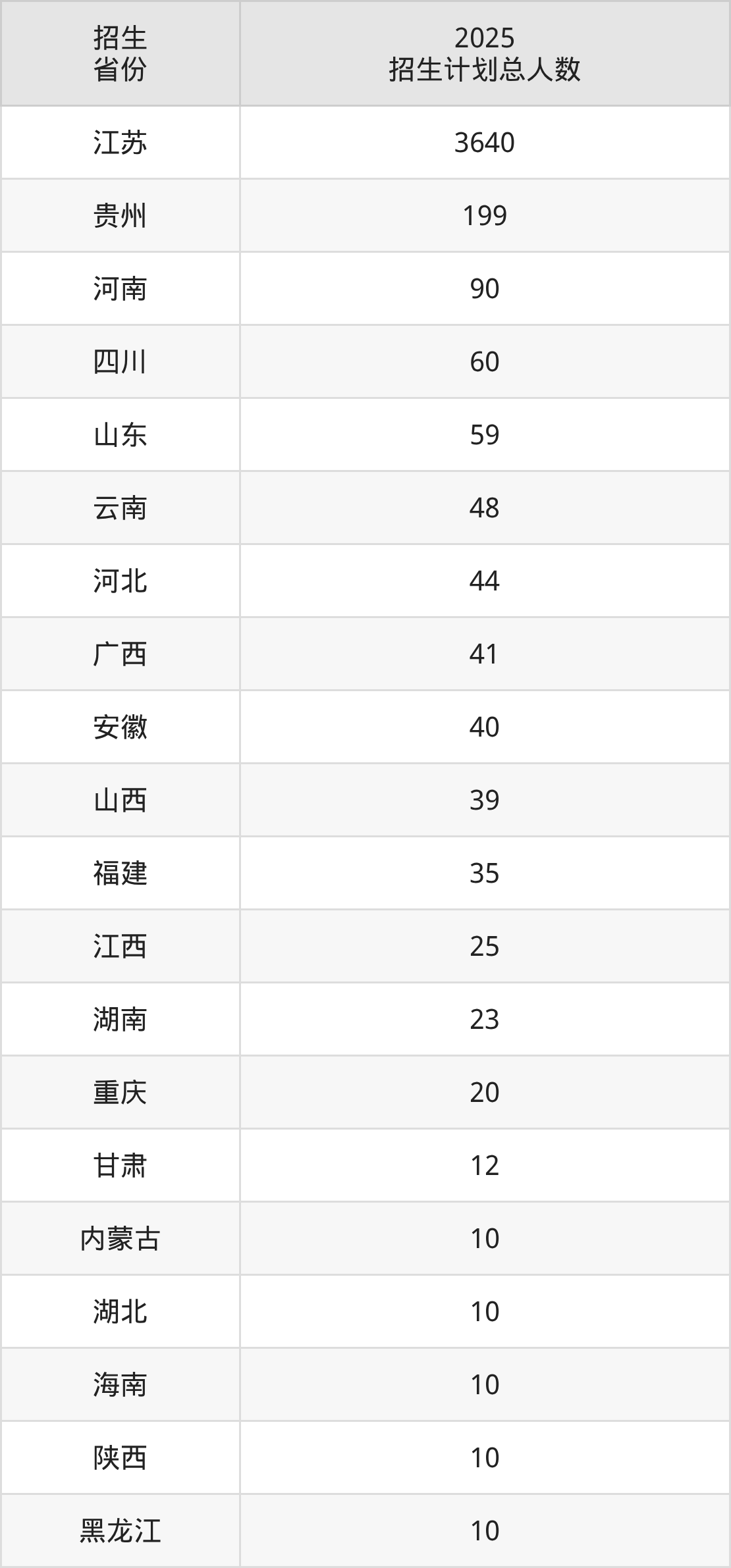 2025年淮安大学面向全国25个省市开展本科招生;招生专业共50个,招生人数共4475人。2025年在江苏省招生计划总人数是3640人,其中,淮安大学在江苏省招生人数最多的是机械设计制造及其自动化。淮安大学在各省具体招生人数情况如下表。