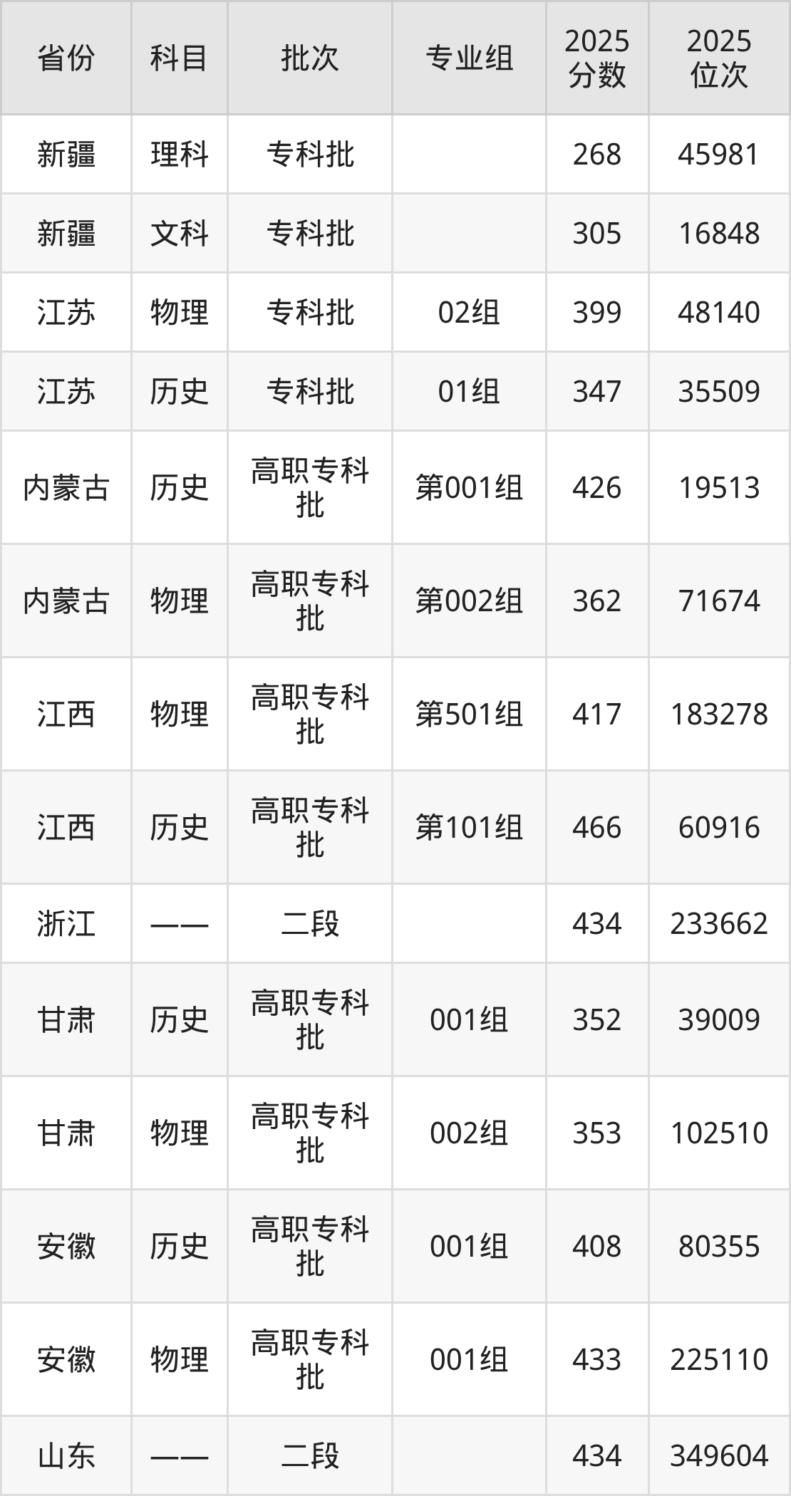 2025年河南职业技术学院全国录取分数线是268分到466分,录取最低在新疆理科、录取最高在江西历史类(第101组)。各省各专业组最低分具有差异,详情如下: