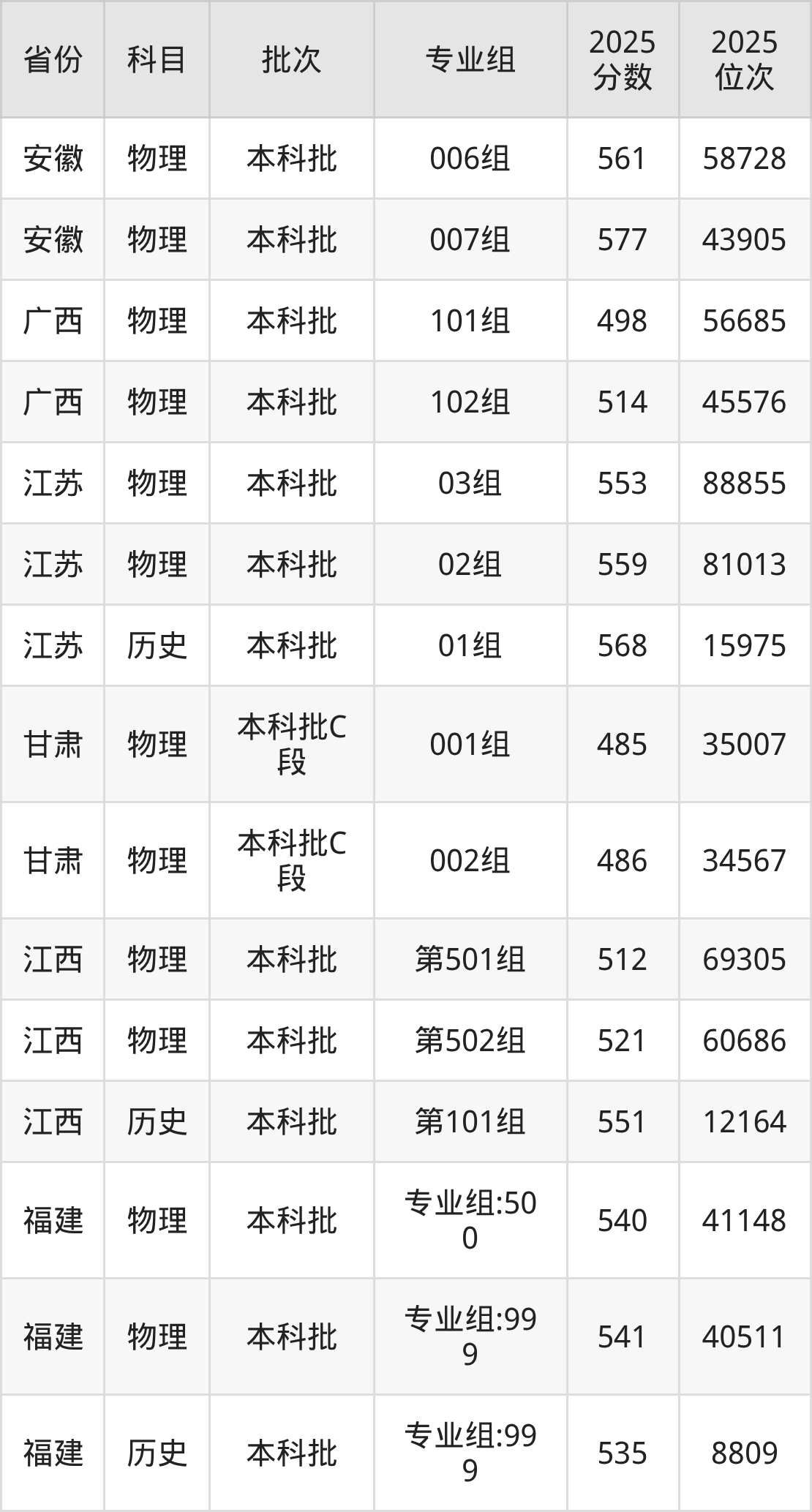 2025年在本科物理类进行招生,各专业组分数线详情如下:
