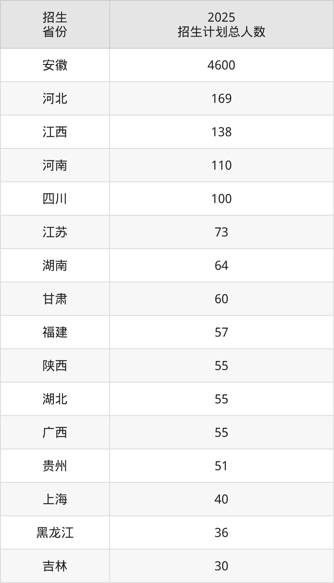 2025年安徽工业大学面向全国24个省市开展本科招生;招生专业共57个,招生人数共5850人。2025年在安徽省招生计划总人数是4600人,其中,安徽工业大学在安徽省招生人数最多的是机械设计制造及其自动化。安徽工业大学在各省具体招生人数情况如下表。