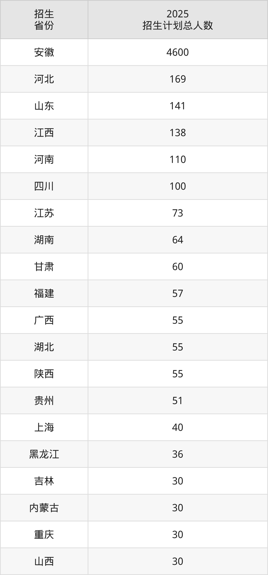 2025年安徽工业大学面向全国25个省市开展本科招生;招生专业共57个,招生人数共5991人。2025年在安徽省招生计划总人数是4600人,其中,安徽工业大学在安徽省招生人数最多的是机械设计制造及其自动化。安徽工业大学在各省具体招生人数情况如下表。
