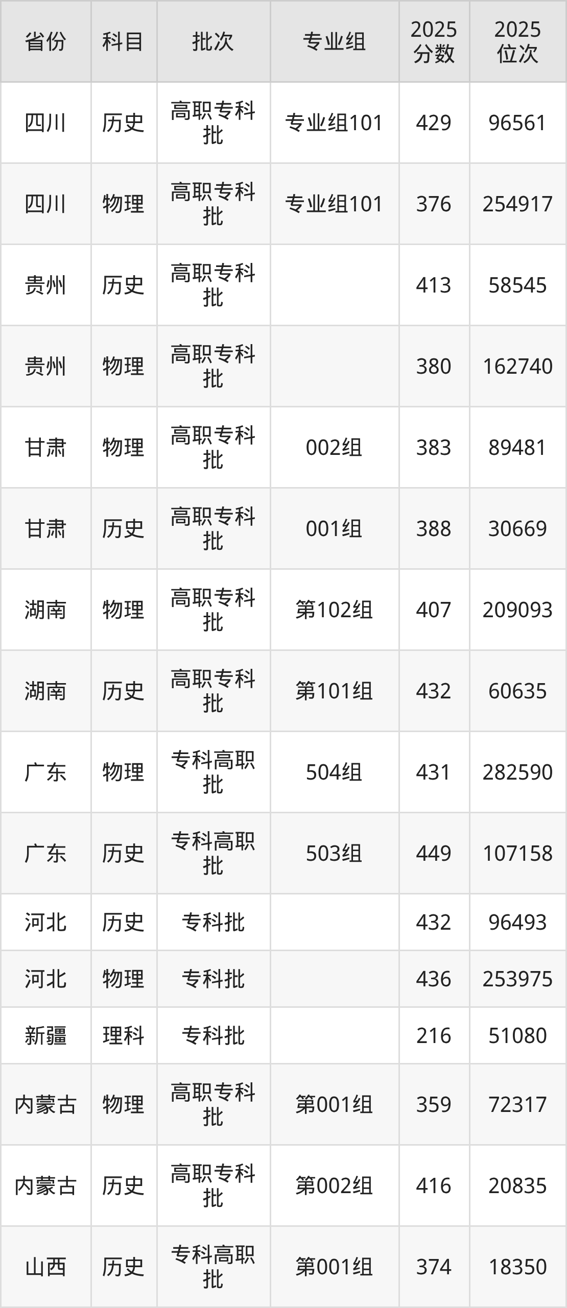 2025年在专科理科进行招生,各专业组分数线详情如下: