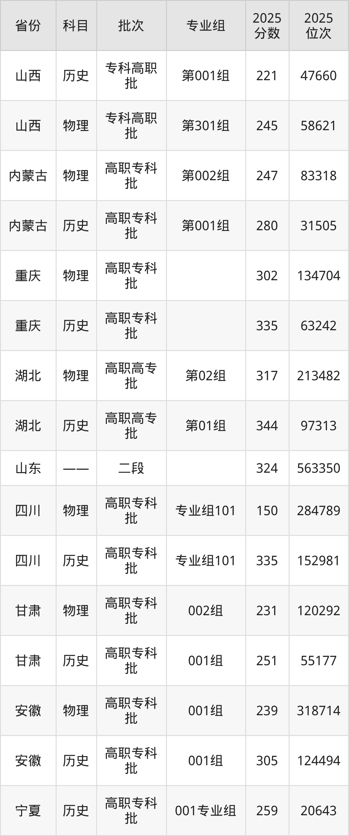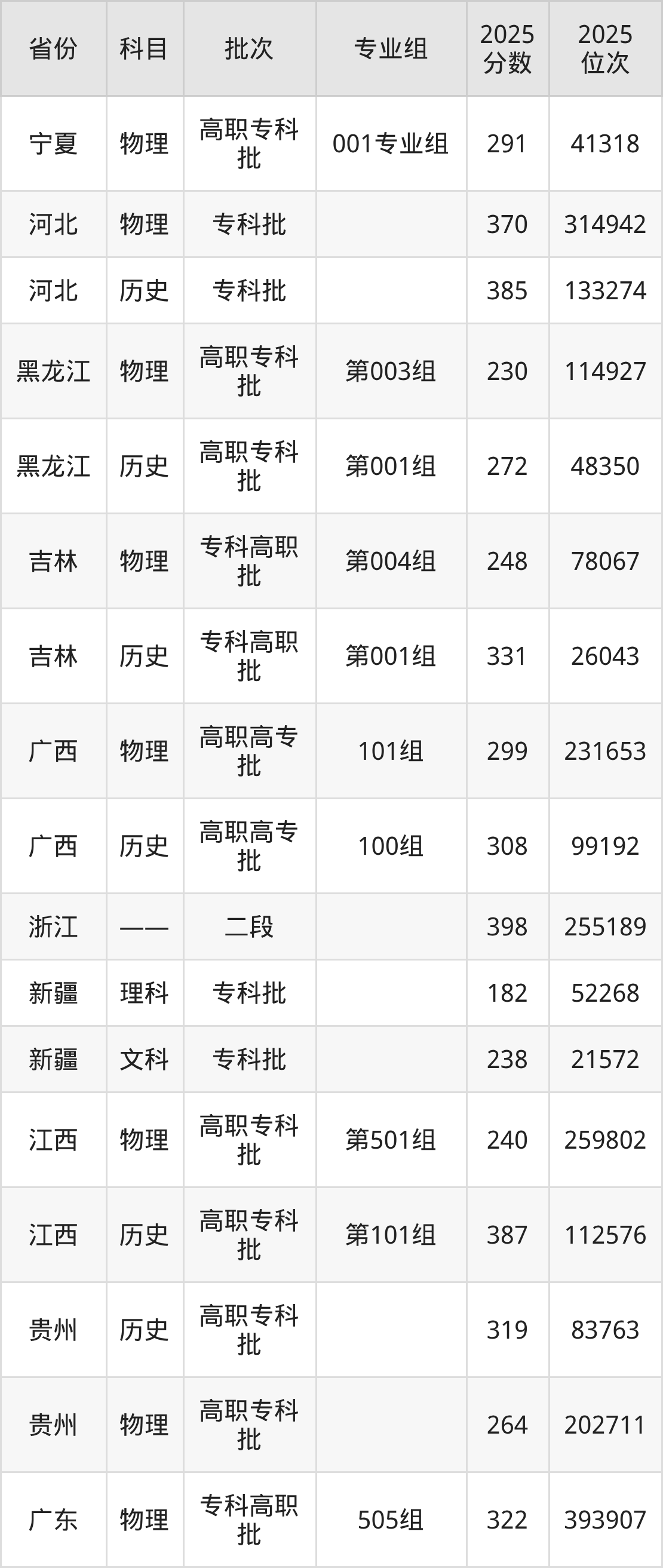 普通类专科物理类最低322分,专科历史类最低389分