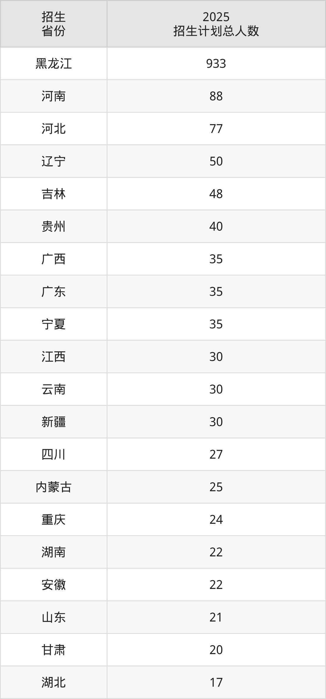 2025年齐齐哈尔高等师范专科学校面向全国22个省市开展专科招生;招生专业共20个,招生人数共1635人。2025年在黑龙江省招生计划总人数是933人,其中,齐齐哈尔高等师范专科学校在黑龙江省招生人数最多的是汽车制造与试验技术。齐齐哈尔高等师范专科学校在各省具体招生人数情况如下表。