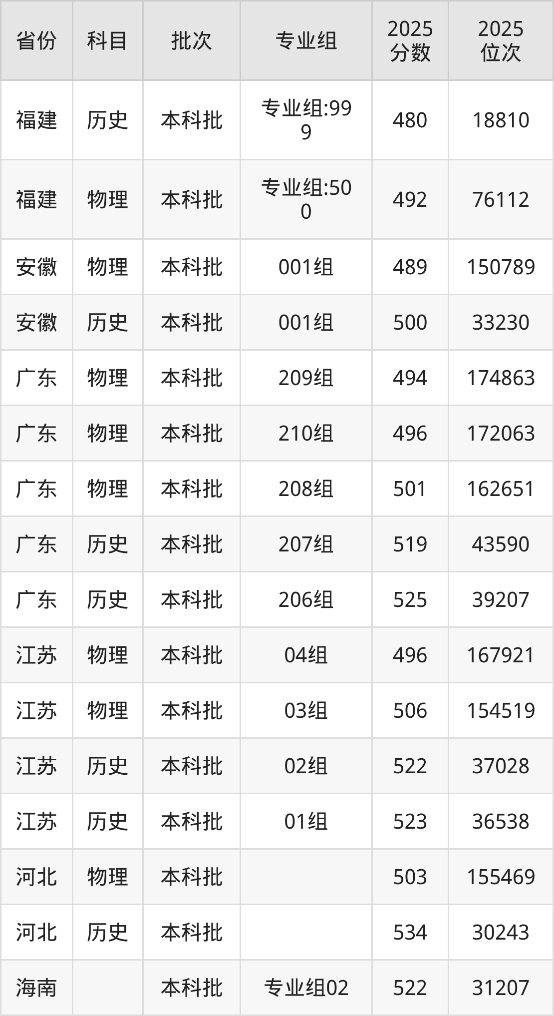 2025年在本科物理类进行招生,各专业组分数线详情如下: