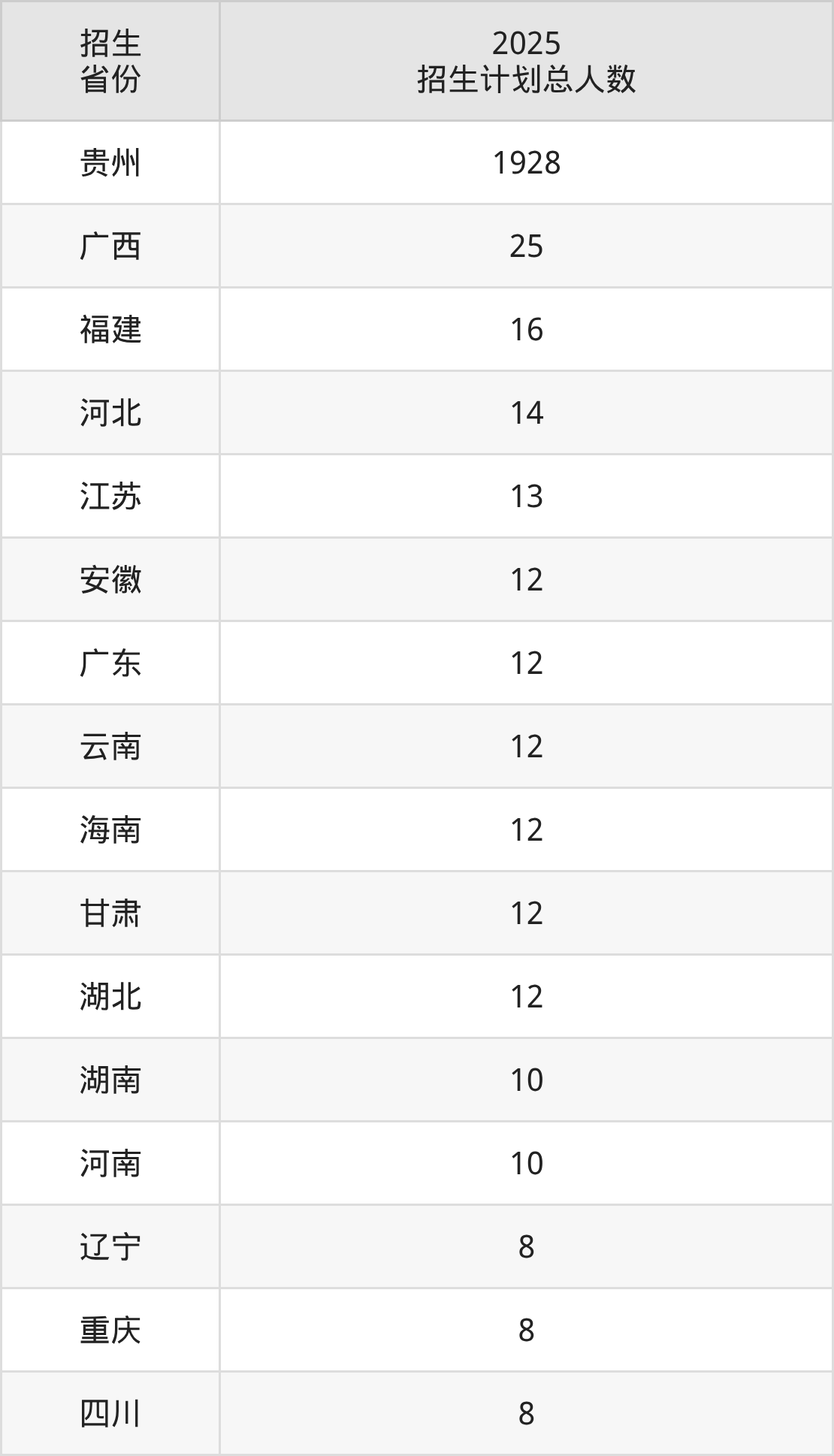 2025年贵州工程应用技术学院面向全国16个省市开展本科招生;招生专业共35个,招生人数共2112人。2025年在贵州省招生计划总人数是1928人,其中,贵州工程应用技术学院在贵州省招生人数最多的是安全工程。贵州工程应用技术学院在各省具体招生人数情况如下表。
