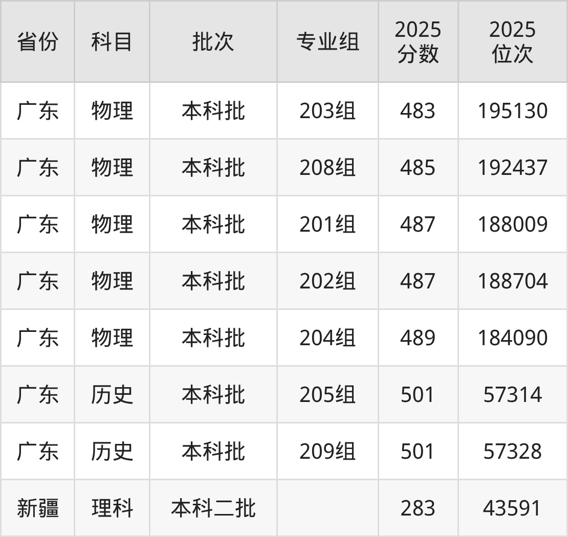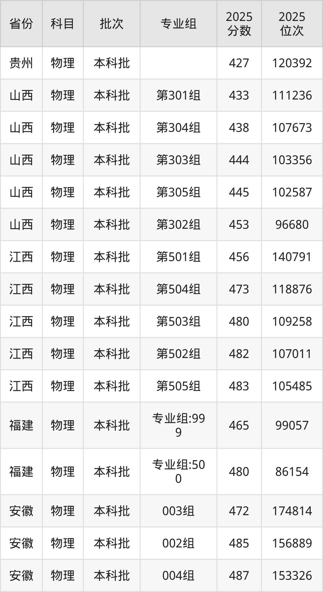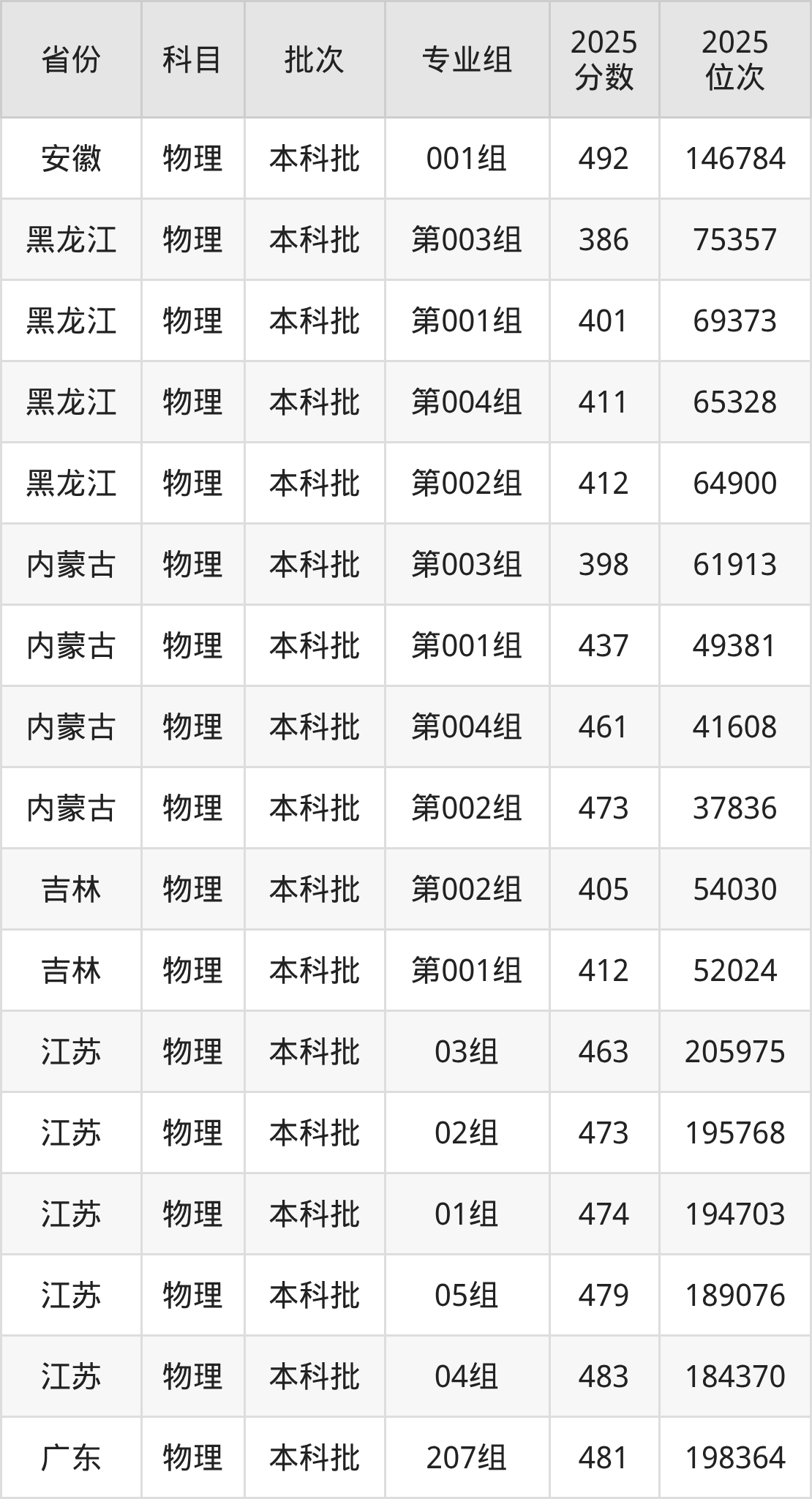 2025年在本科物理类进行招生,各专业组分数线详情如下: