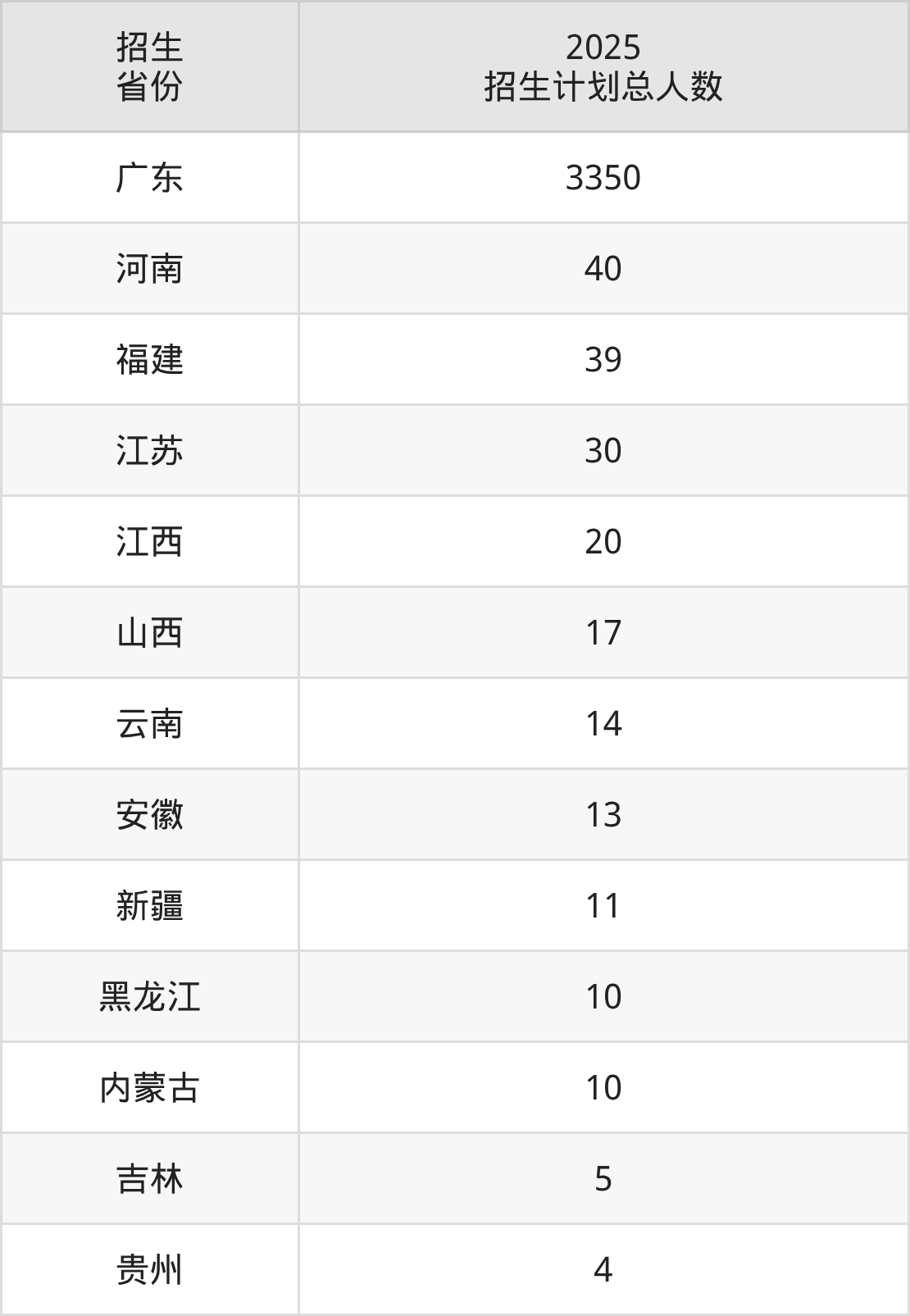 2025年电子科技大学中山学院面向全国13个省市开展本科招生;招生专业共29个,招生人数共3563人。2025年在广东省招生计划总人数是3350人,其中,电子科技大学中山学院在广东省招生人数最多的是计算机科学与技术。电子科技大学中山学院在各省具体招生人数情况如下表。
