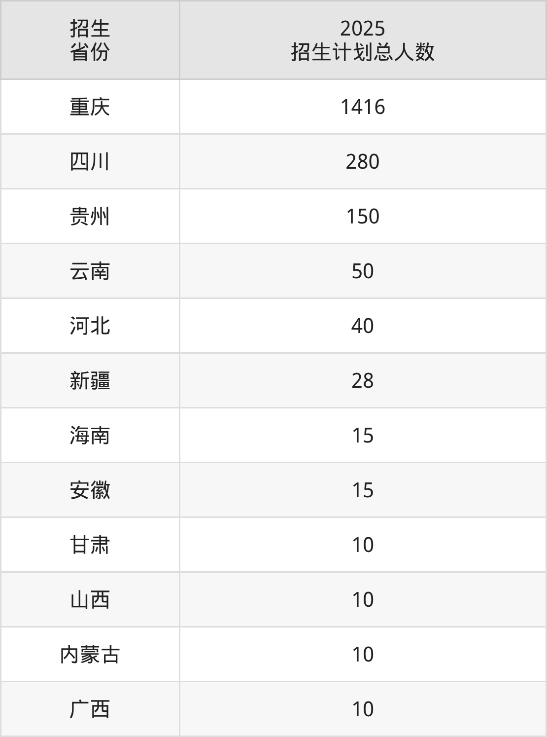 2025年重庆商务职业学院面向全国12个省市开展专科招生;招生专业共35个,招生人数共2034人。2025年在重庆市招生计划总人数是1416人,其中,重庆商务职业学院在重庆市招生人数最多的是大数据与会计。重庆商务职业学院在各省具体招生人数情况如下表。