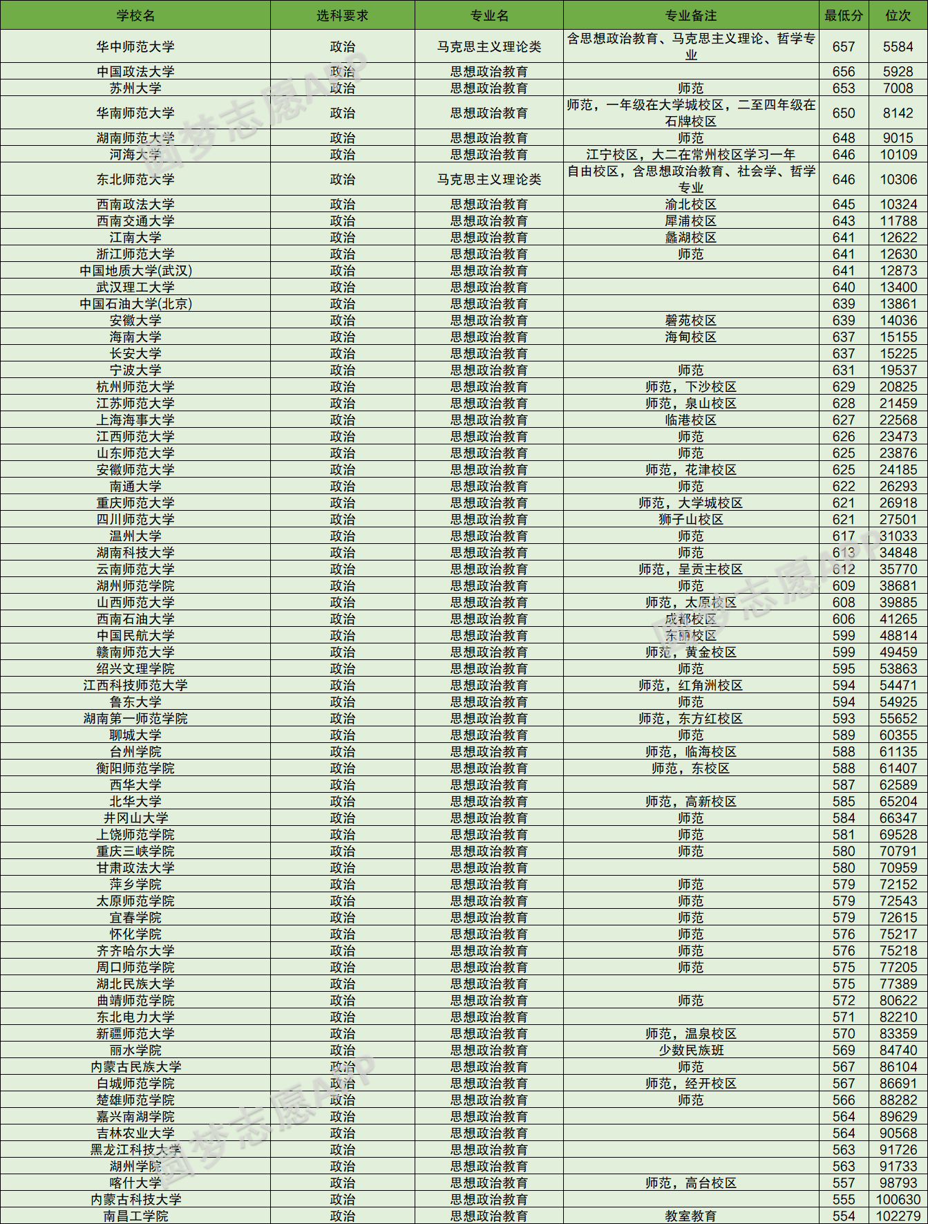 根据下表可知,全国思想政治教育分数最高最好的大学为华中师范大学、中国政法大学、苏州大学、华南师范大学、湖南师范大学,对应最低分数为657分、656分、653分、650分、648分。