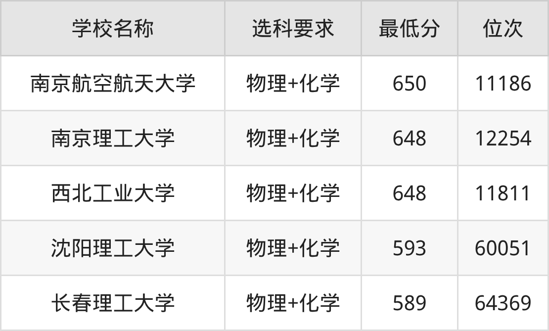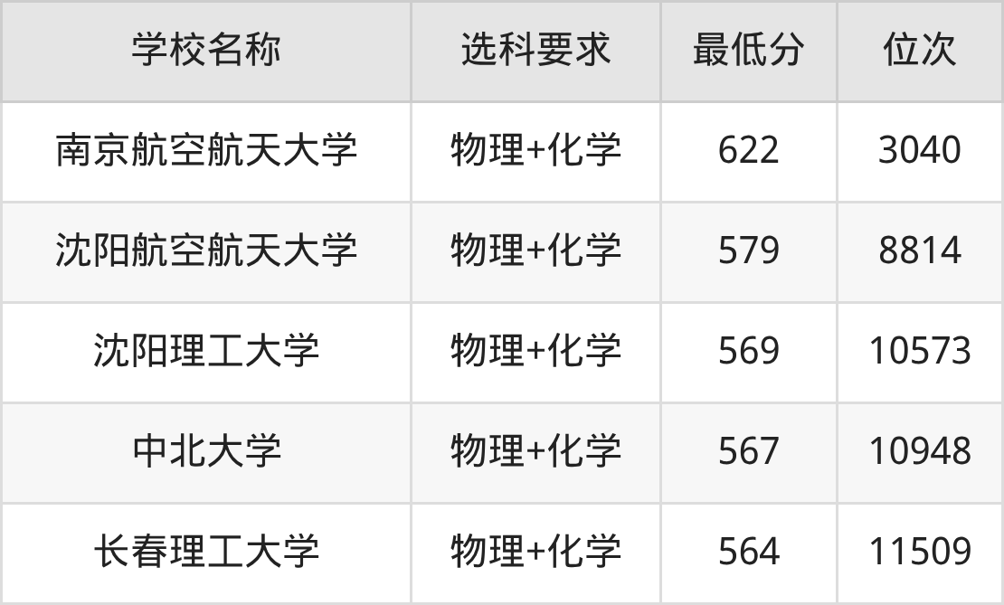 在吉林招生的院校中,有5所要求考生必选“物理+化学”,如南京航空航天大学、沈阳航空航天大学等。