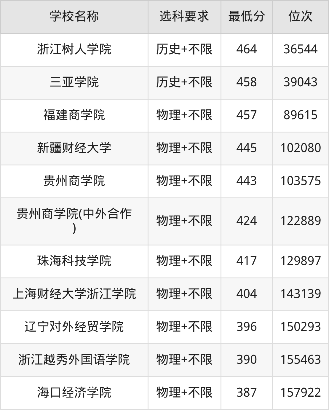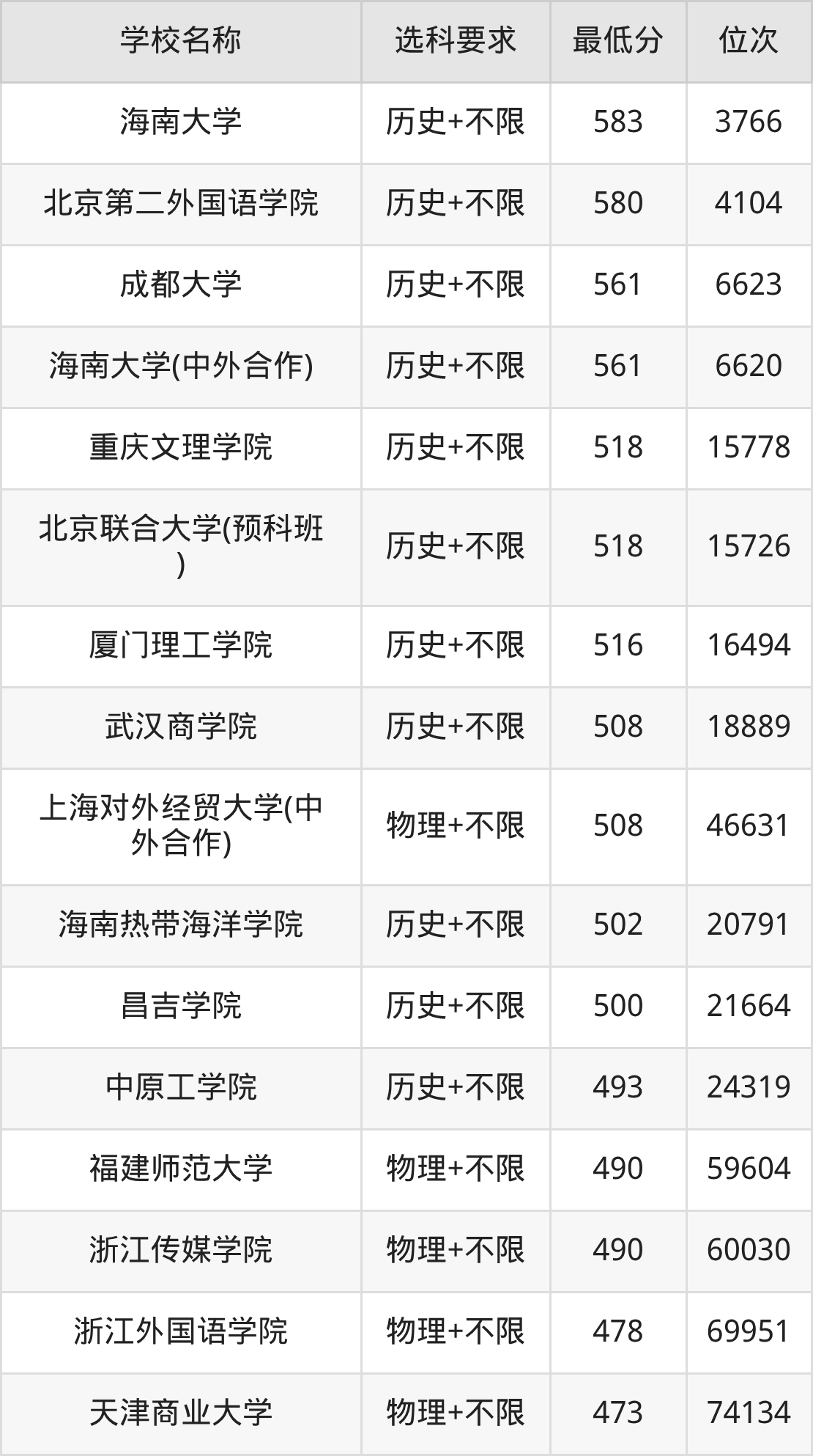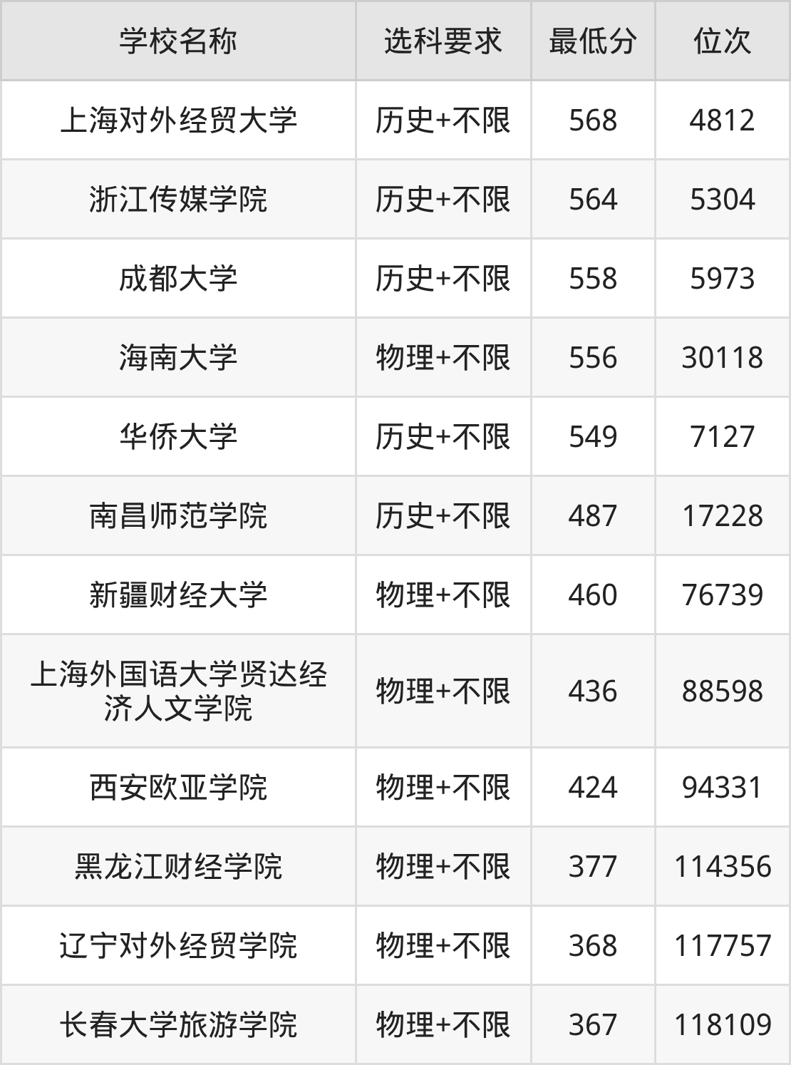在贵州招生的院校中,有14所不限选科要求(物理组),如上海对外经贸大学(中外合作)、福建师范大学等;有13所不限选科要求(历史组),如海南大学、北京第二外国语学院等。