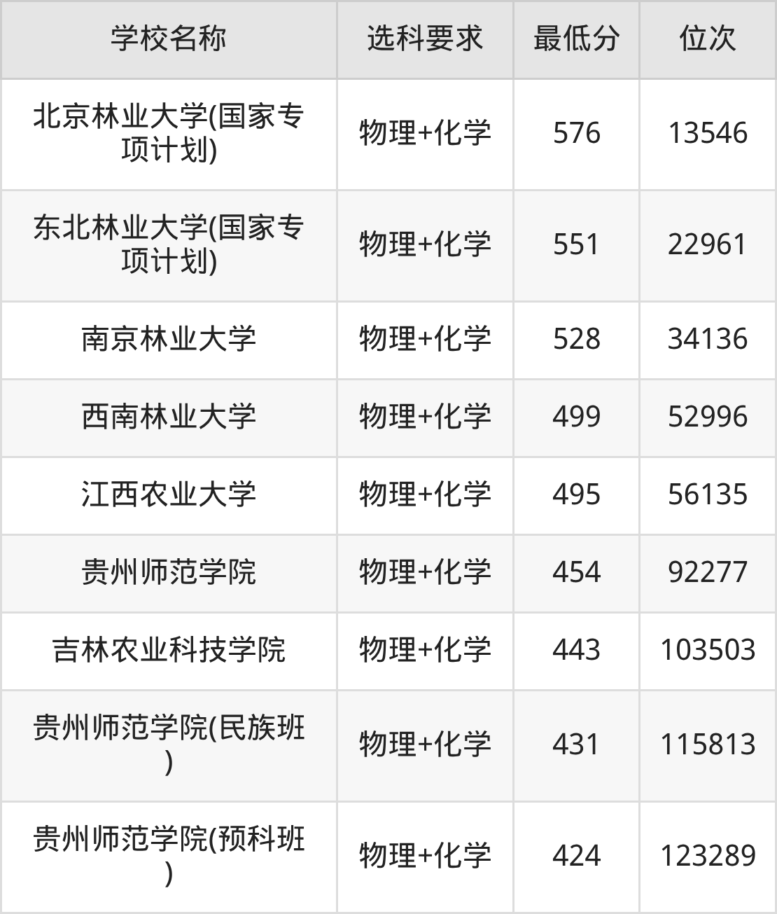 在贵州招生的院校中,有9所要求考生必选“物理+化学”,如北京林业大学(国家专项计划)、东北林业大学(国家专项计划)等。