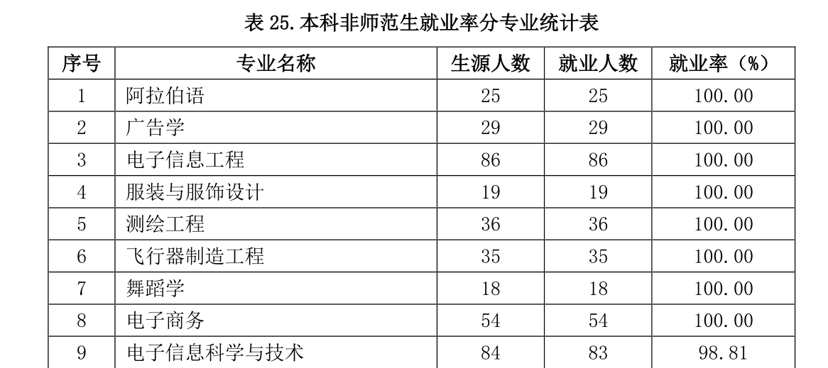 非师范类专业中,广告学、电子信息工程、电子商务等8个专业就业率为100%;电子信息科学与技术、工商管理等15个专业就业率超过了95%。