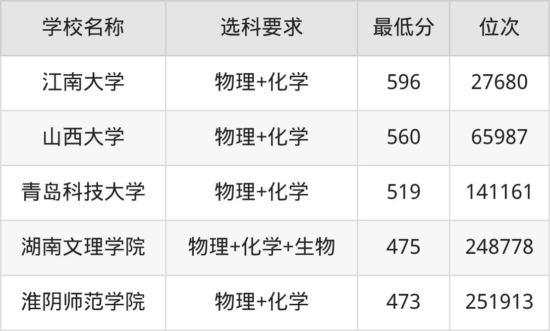 在山东招生的院校中,有4所要求考生必选“物理+化学”,如江南大学、山西大学等;有1所要求考生必选“物理+化学+生物”,如湖南文理学院。