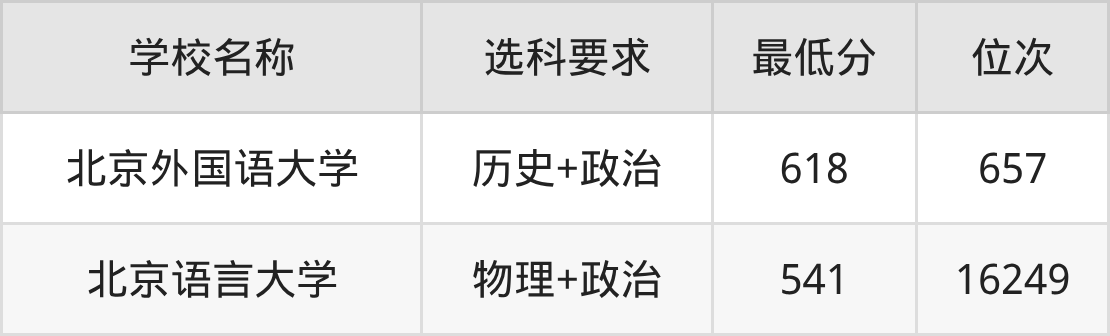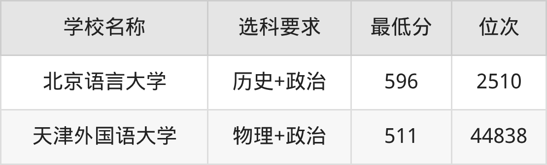 在贵州招生的院校中,有1所要求考生必选“历史+政治”,如北京语言大学;有1所要求考生必选“物理+政治”,如天津外国语大学。