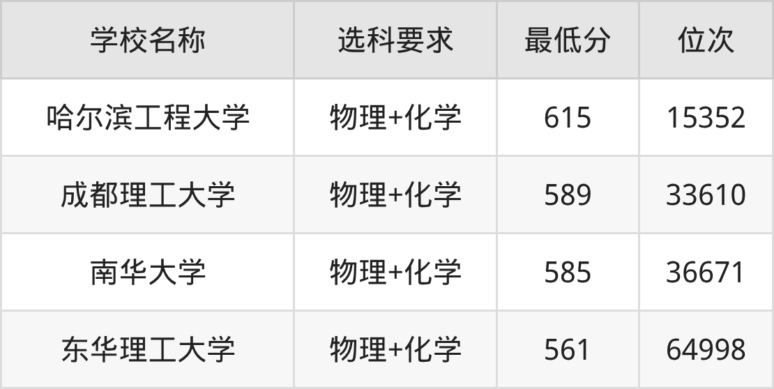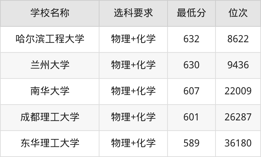 需要注意的是,核化工与核燃料工程专业大学中有4所要求考生必选“物理+化学”,如哈尔滨工程大学、成都理工大学等,因此大家在报考前要提前了解清楚专业选科要求。