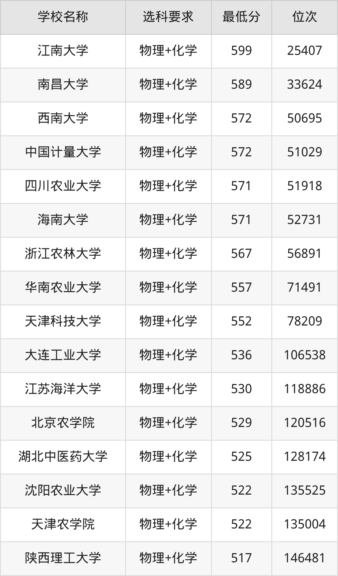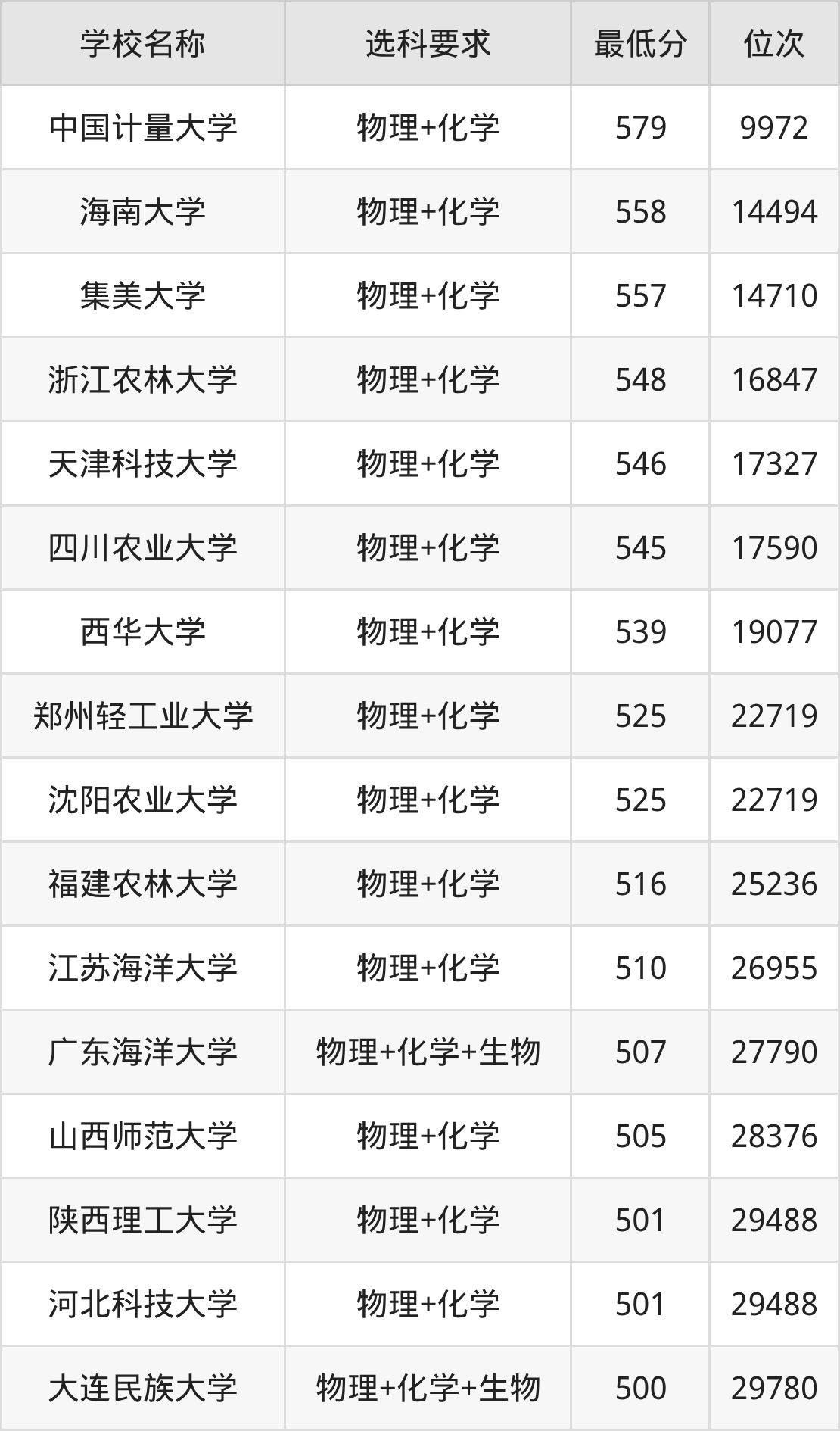 需要注意的是,食品质量与安全专业大学中有40所要求考生必选“物理+化学”,如中国计量大学、海南大学等;有4所要求考生必选“物理+化学+生物”,如广东海洋大学、大连民族大学等,因此大家在报考前要提前了解清楚专业选科要求。