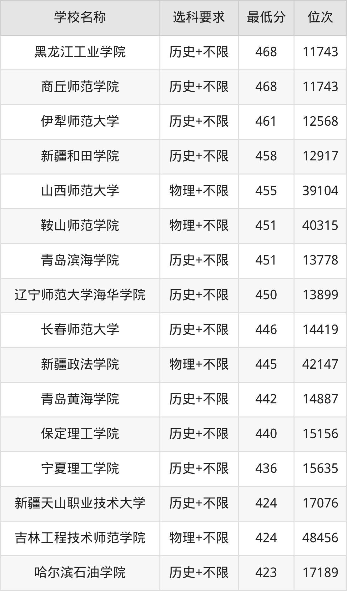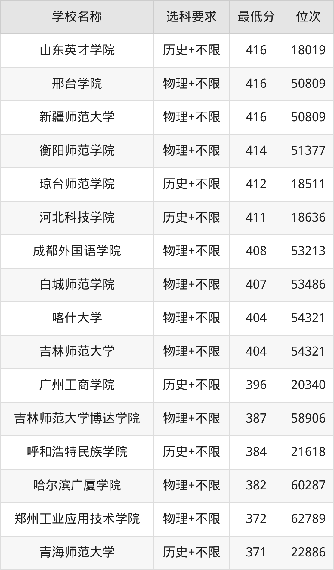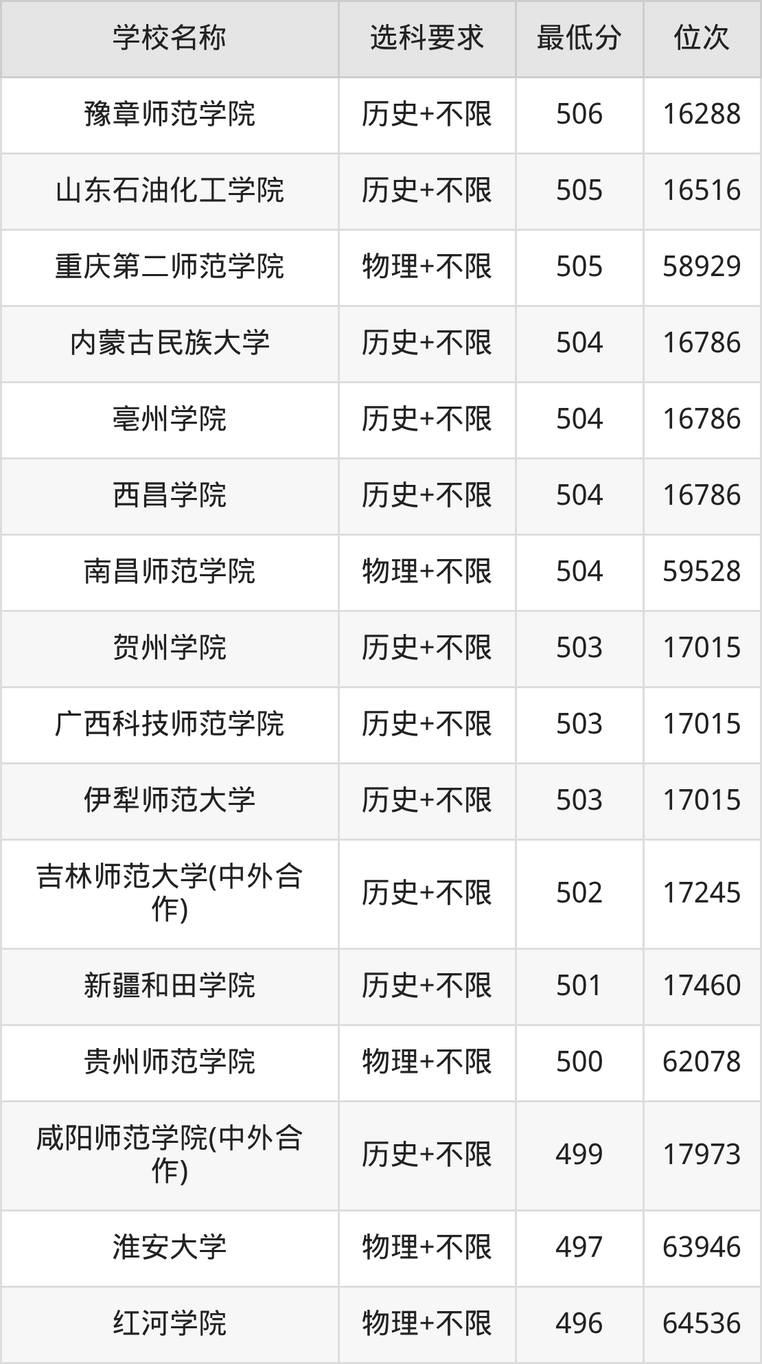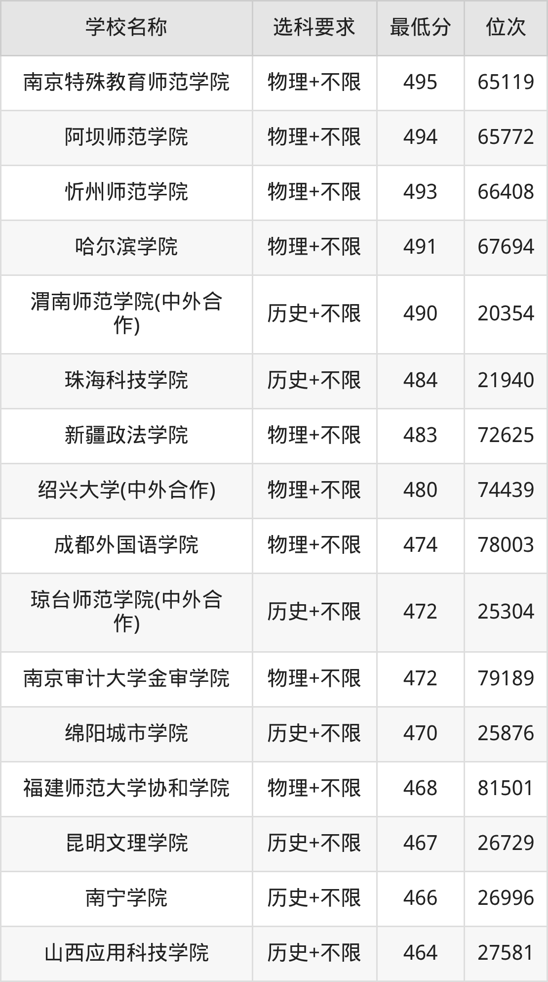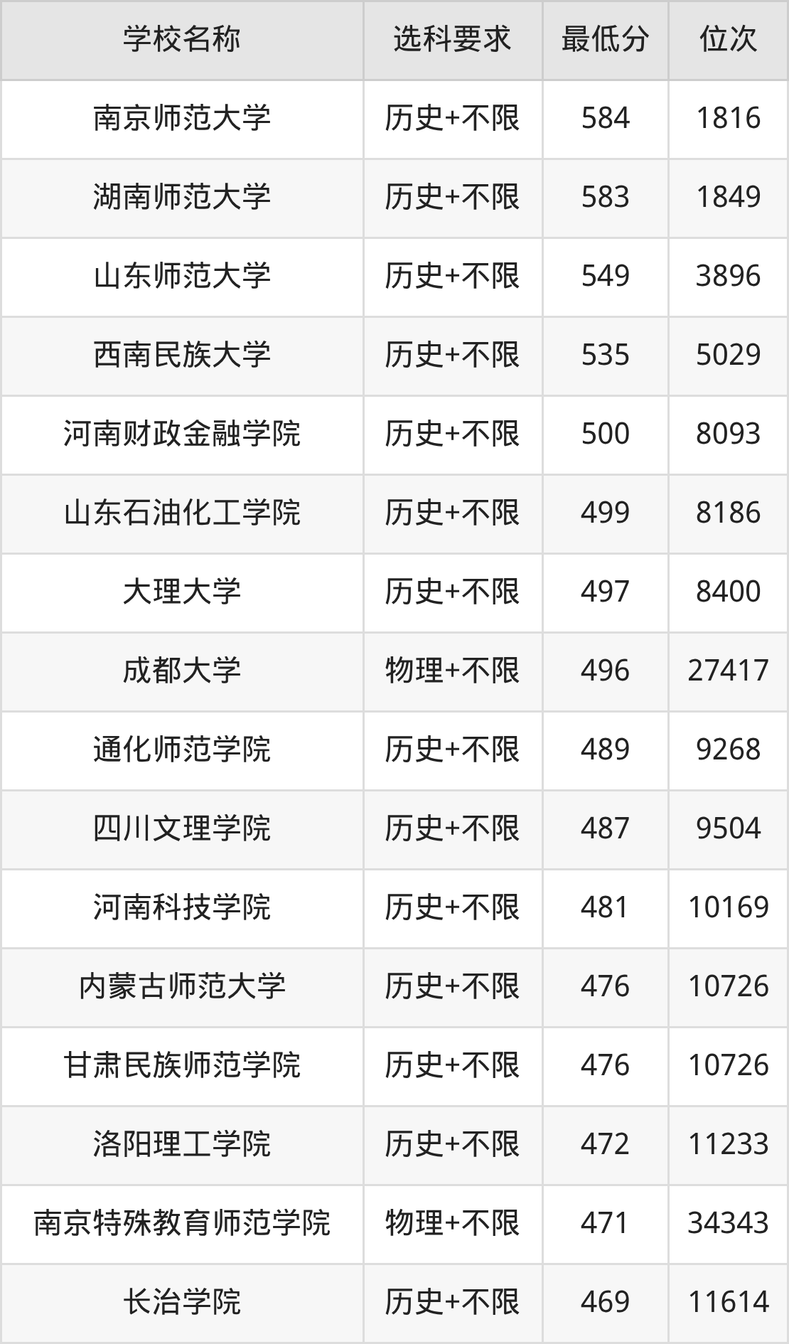 在吉林招生的院校中,有32所不限选科要求(历史组),如南京师范大学、湖南师范大学等;有22所不限选科要求(物理组),如成都大学、南京特殊教育师范学院等。