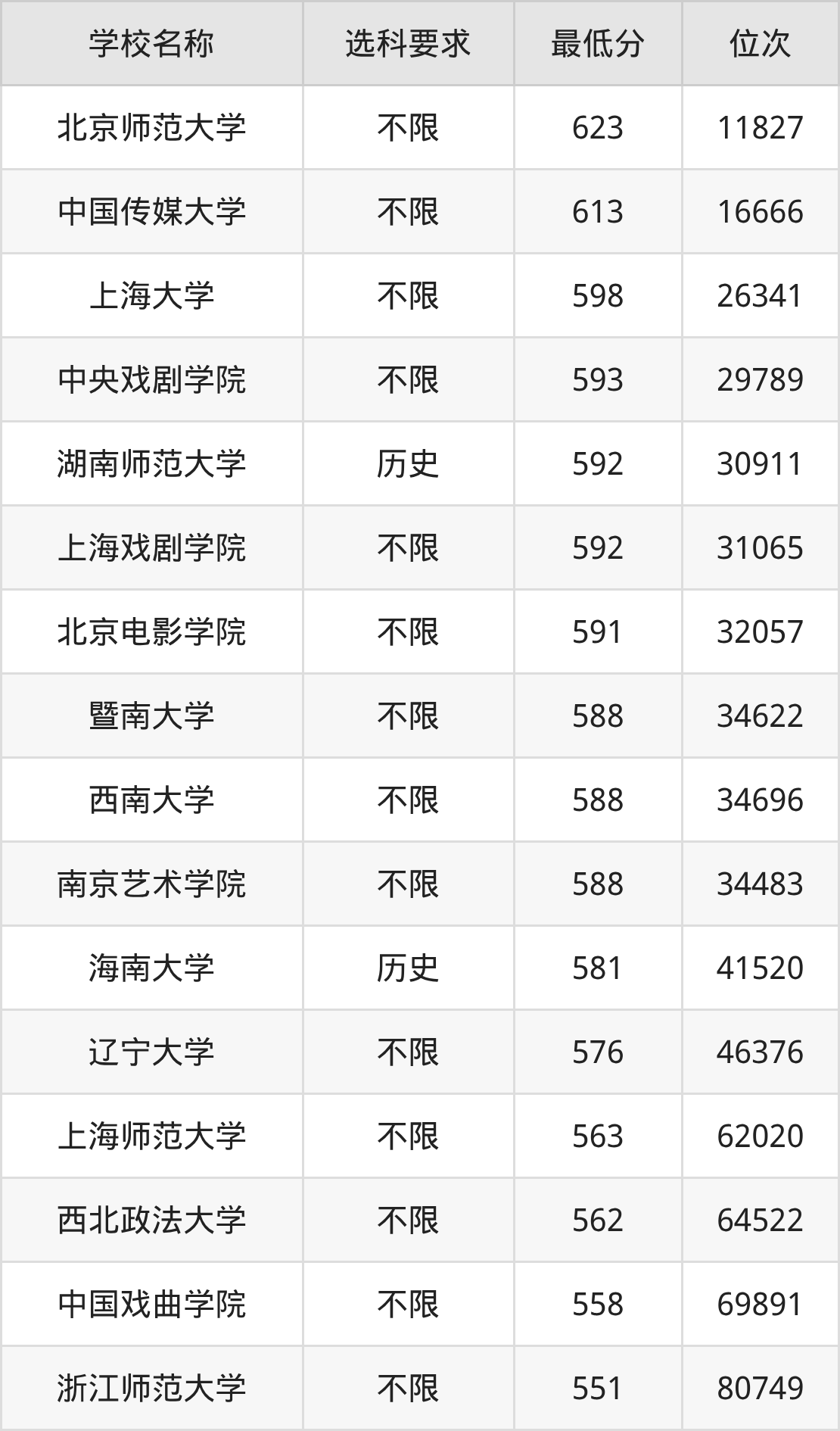 需要注意的是,戏剧影视文学专业大学中有37所不限选科要求,如北京师范大学、中国传媒大学等;有5所要求考生必选“历史”,如湖南师范大学、海南大学等,因此大家在报考前要提前了解清楚专业选科要求。