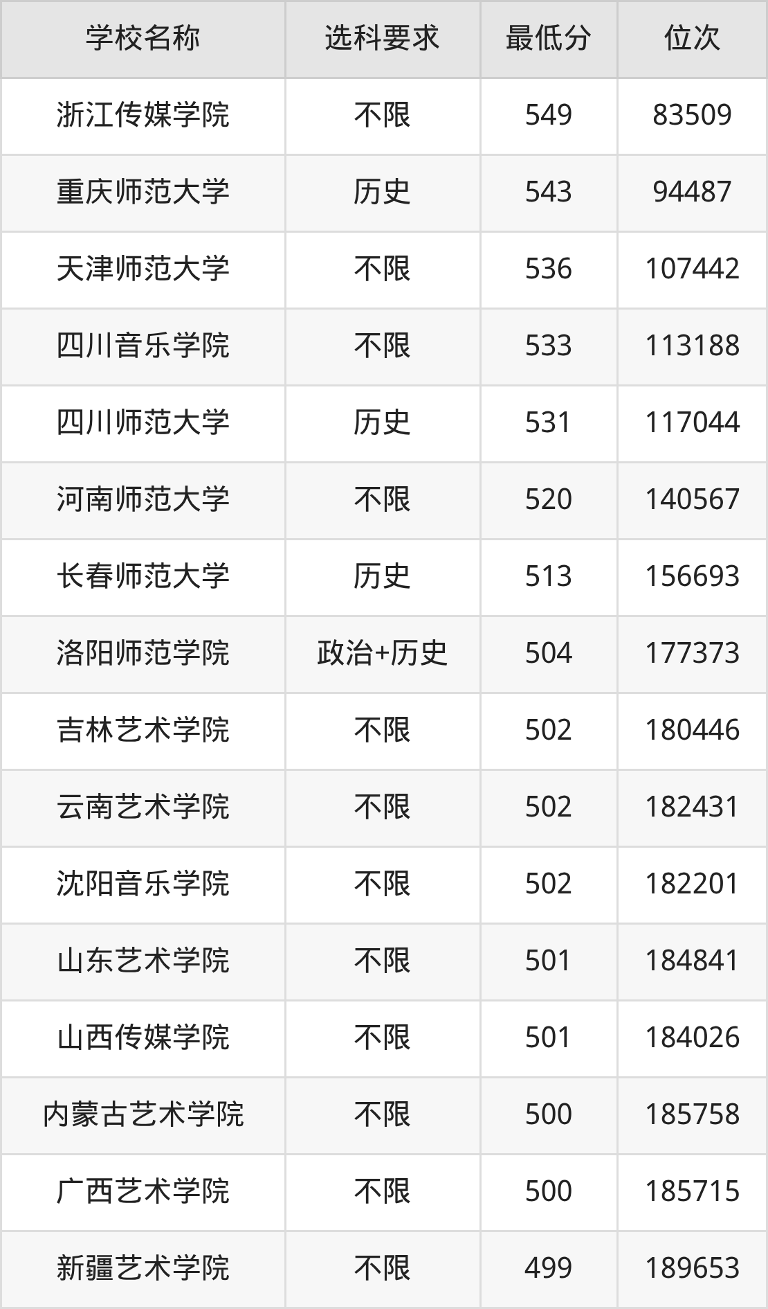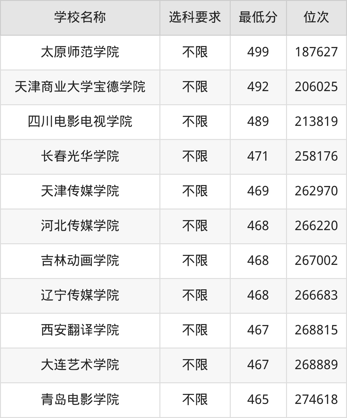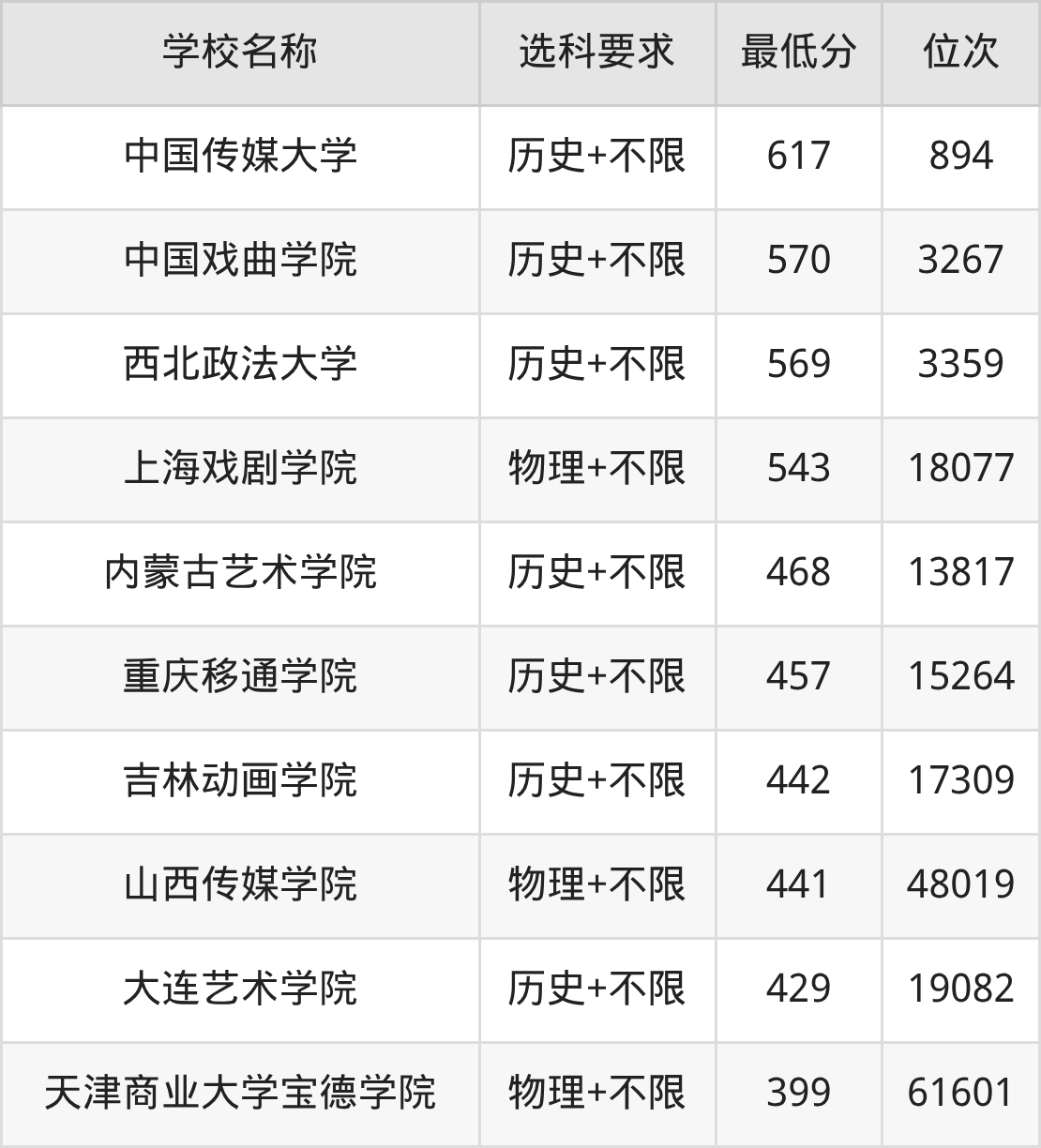 在内蒙古招生的院校中,有7所不限选科要求(历史组),如中国传媒大学、中国戏曲学院等;有3所不限选科要求(物理组),如上海戏剧学院、山西传媒学院等。