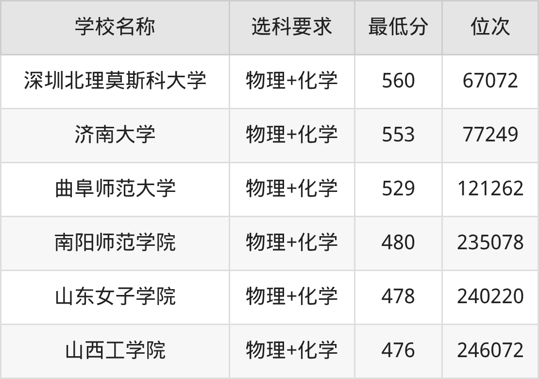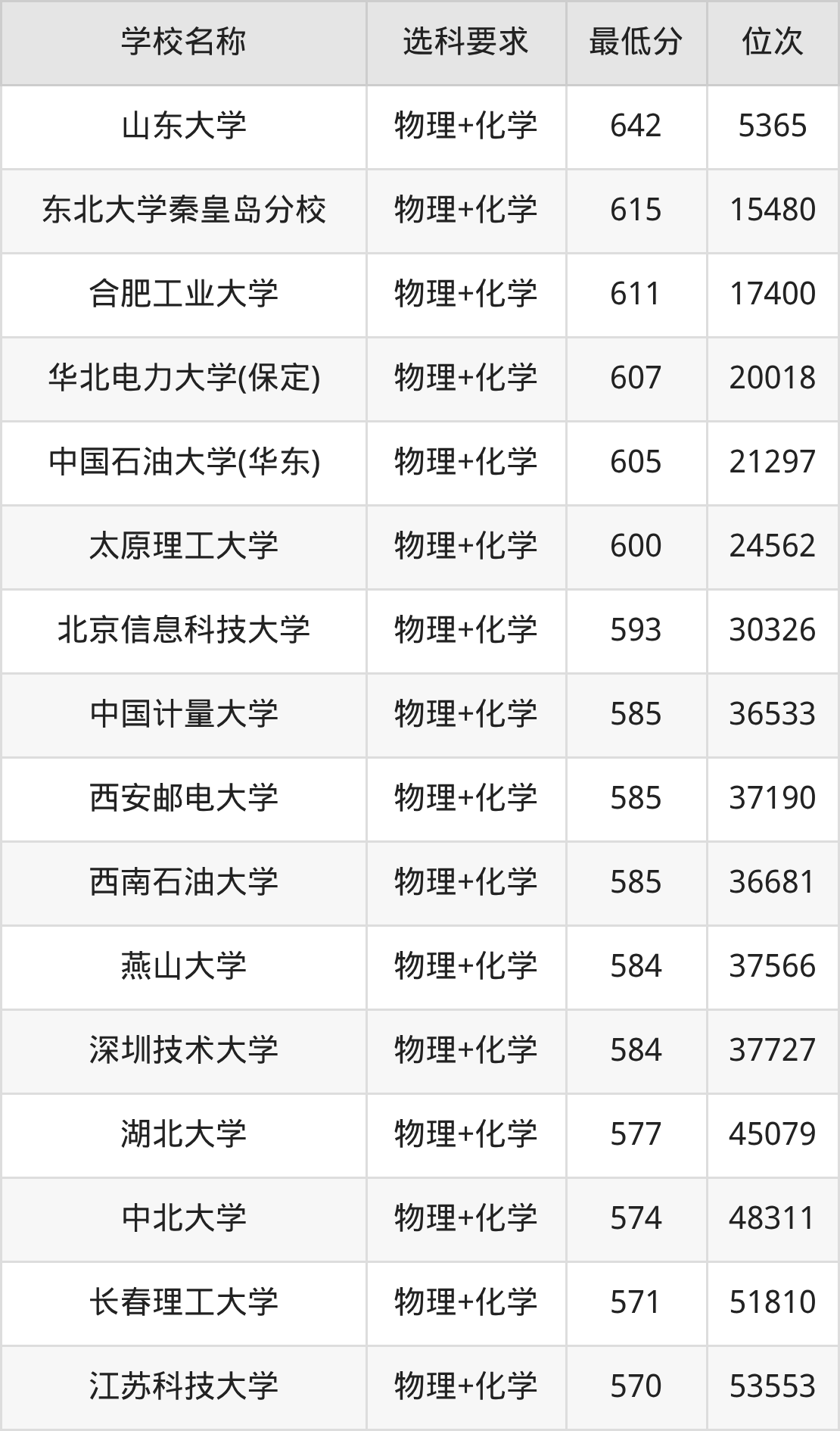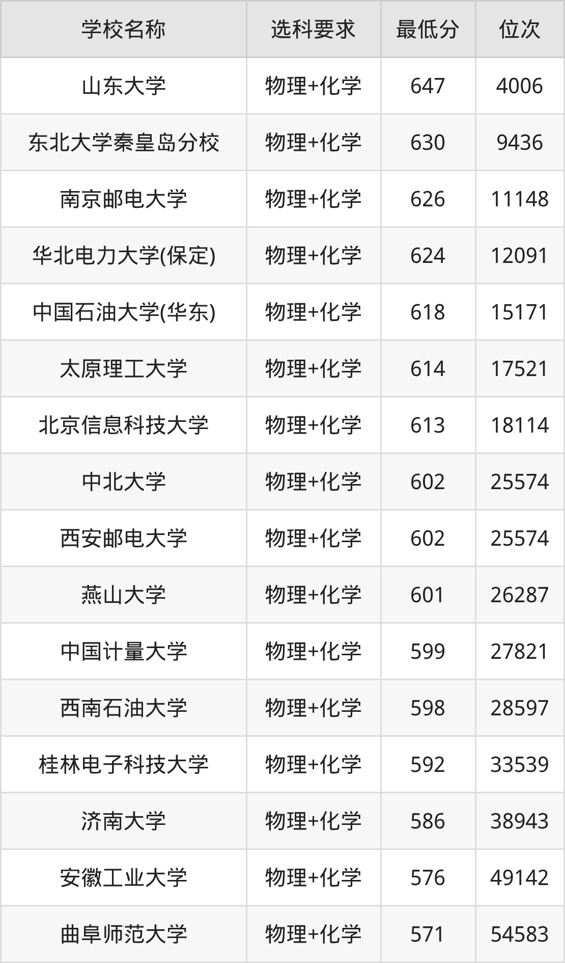 在山东招生的院校中,有22所要求考生必选“物理+化学”,如山东大学、东北大学秦皇岛分校等。